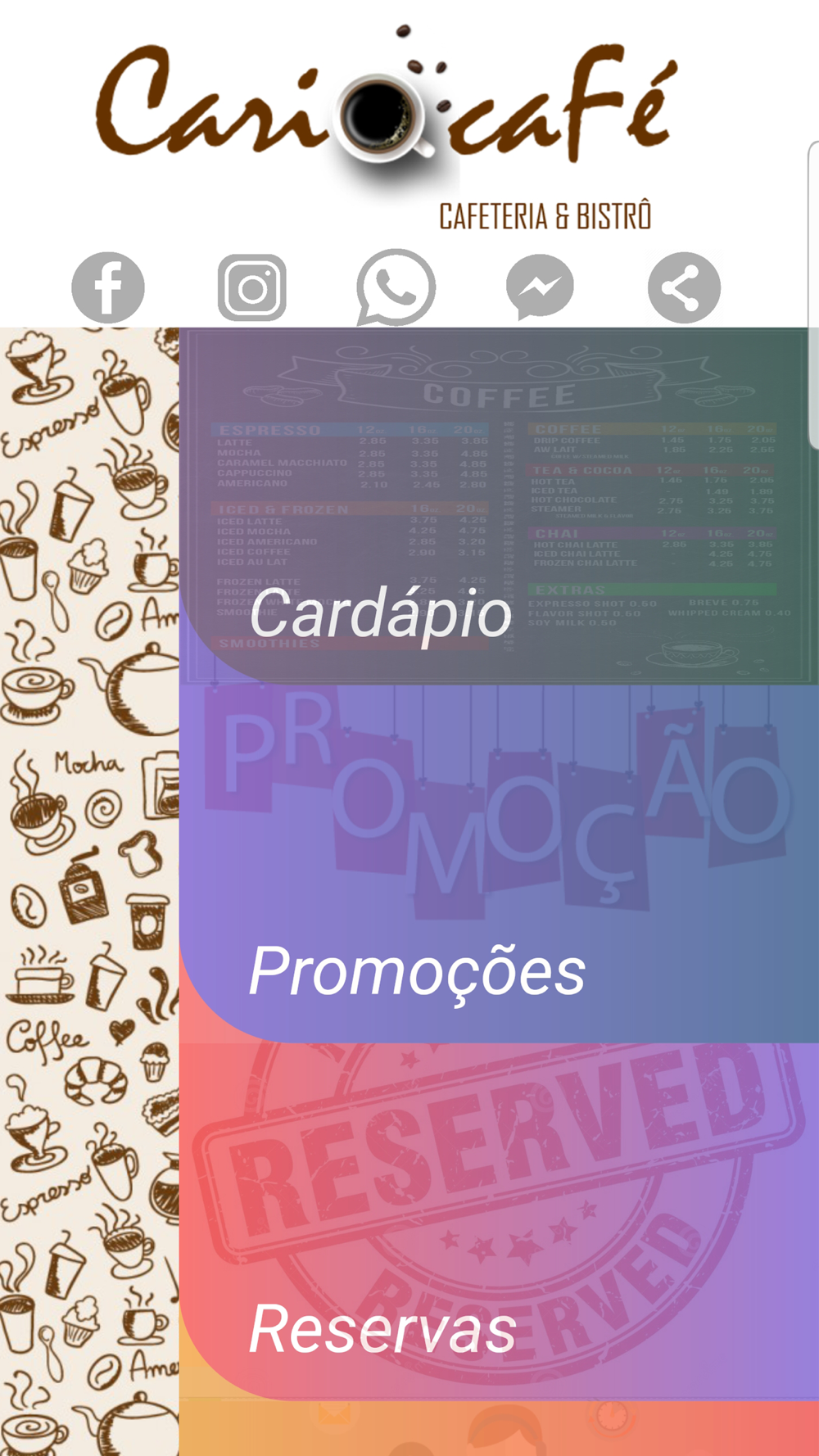 Com nossa aplicação é possível efetuar reservar, enviar mensagens através das redes sociais, checar nosso cardápio, entrar em contacto conosco por telefone, verificar nossas promoções e a localização pelo google maps.