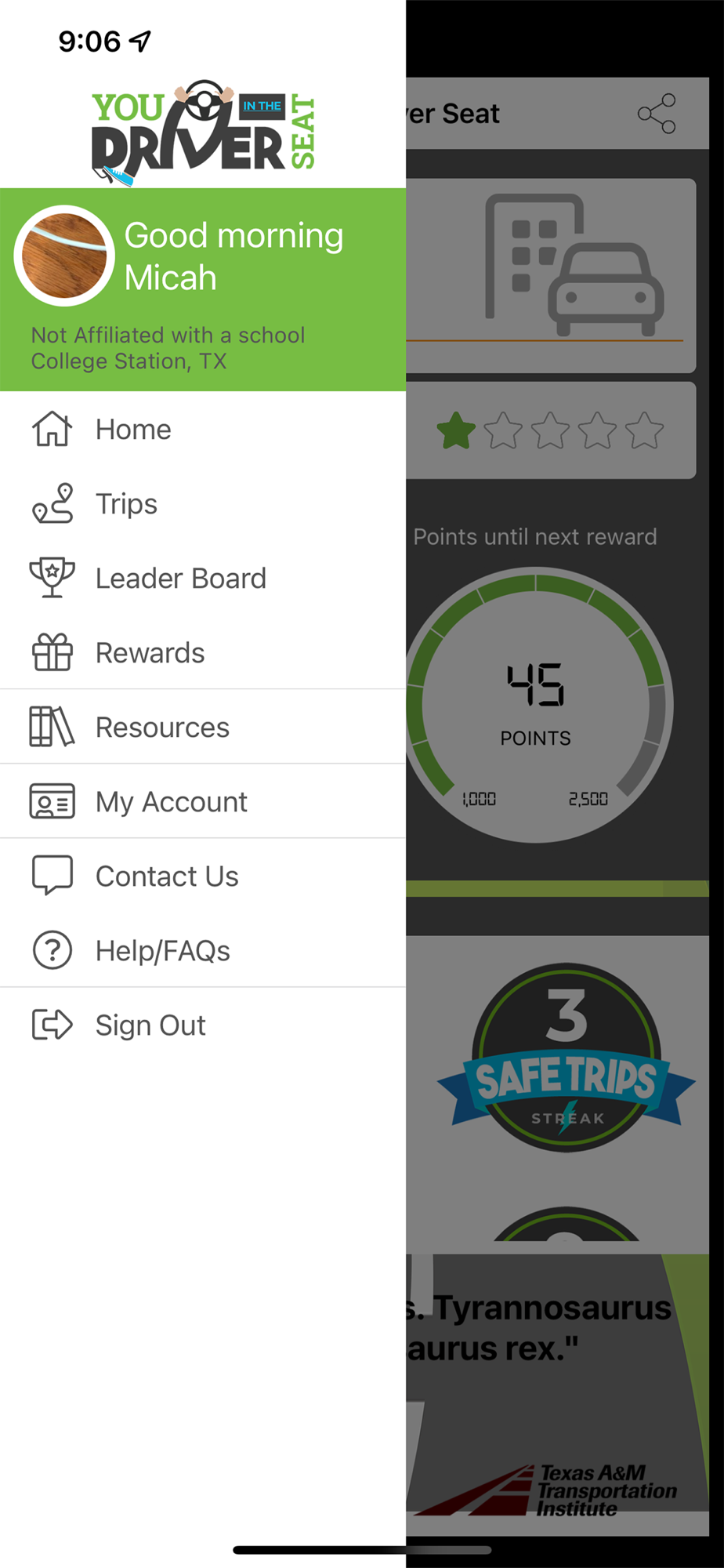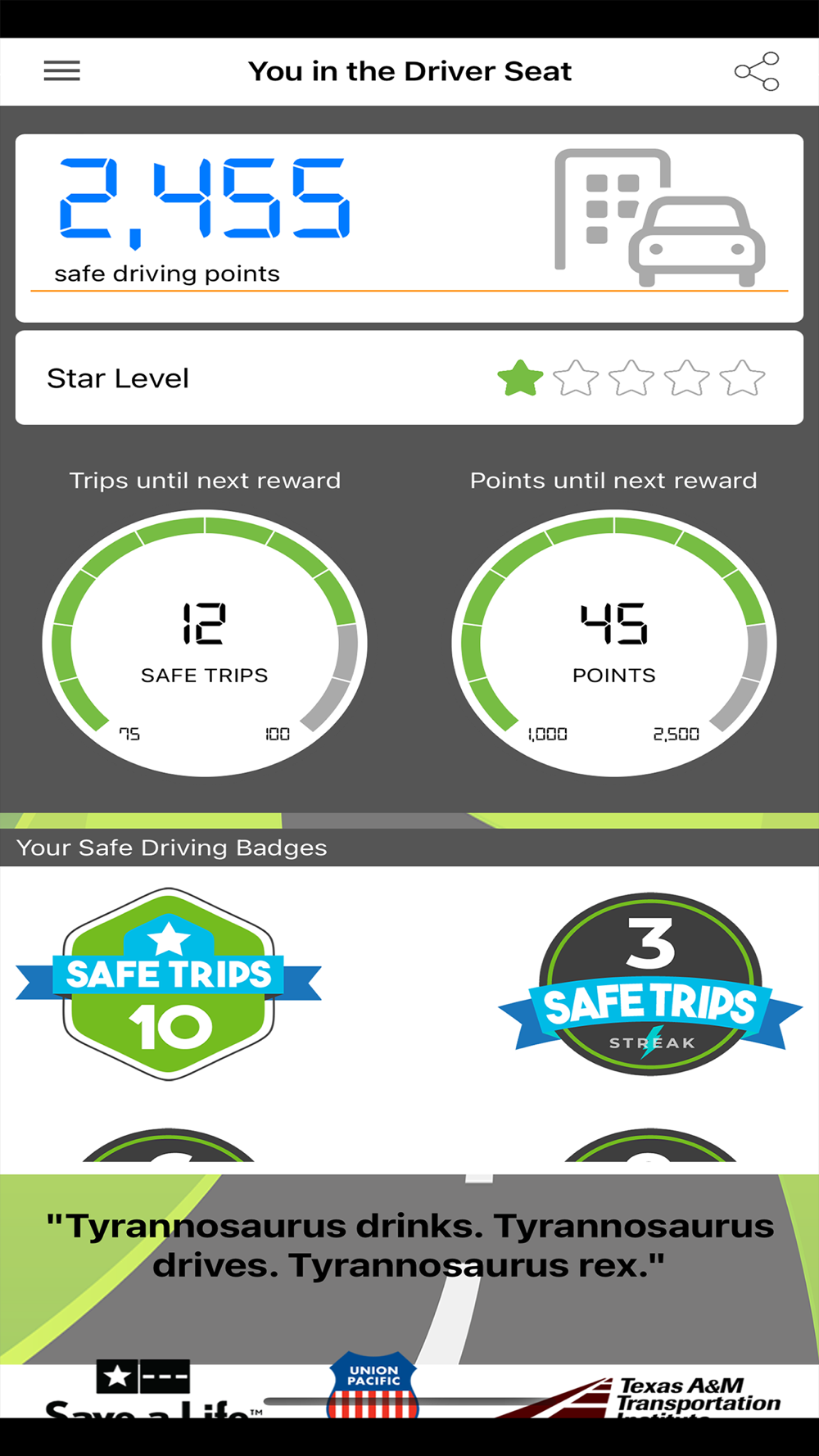 The You In The Driver Seat App is designed to incentivize safe driving by emphasizing the fact that Responsibility has its Rewards. The app will provide a driving score for each trip, and points will be earned for all safe trips that are conducted without a distraction or excessive speeding. Points can be redeemed for gift cards once users achieve certain point levels, and random gifts will also be awarded to users that accumulate assorted achievement levels and badges.