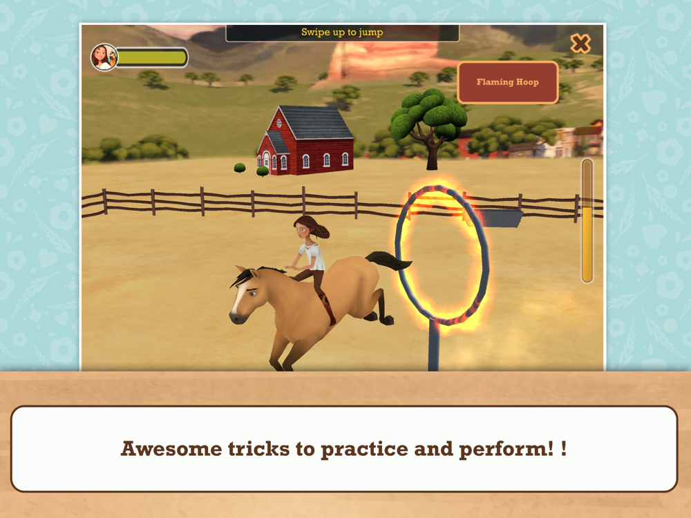 UNLOCK up to 11 different tricks from DreamWorks Spirit Riding Free to practice and perform: No Hands, Stand Up, Backflip even Jump through the Flaming Hoop