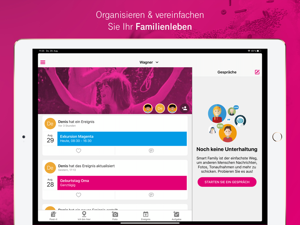 Mit Smart Family wäre Ihnen das nicht passiert. Wir unterstützen Sie und Ihre Familie bei den täglichen Organisationen und Planungen, und erleichtern dadurch Ihren Alltag. Unser All-in-One-Organizer umfasst geteilte Kalender, Einkaufslisten und To Do‘s, die Sie einfach zuweisen können, einer Echtzeitortung für Familienmitglieder, einem Online Speicher für Lieblingsbilder und vieles mehr.