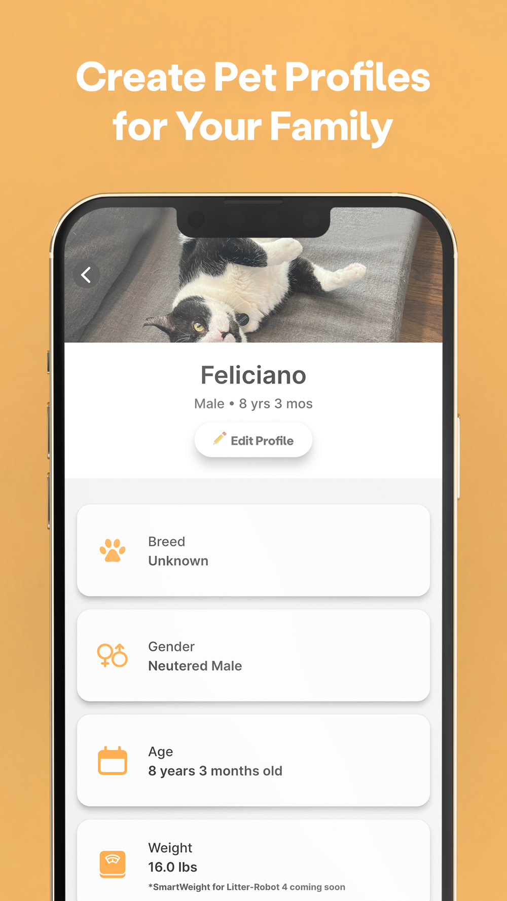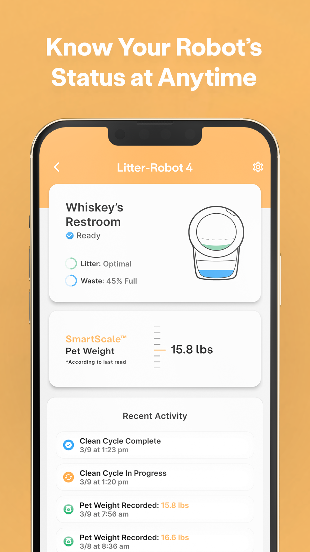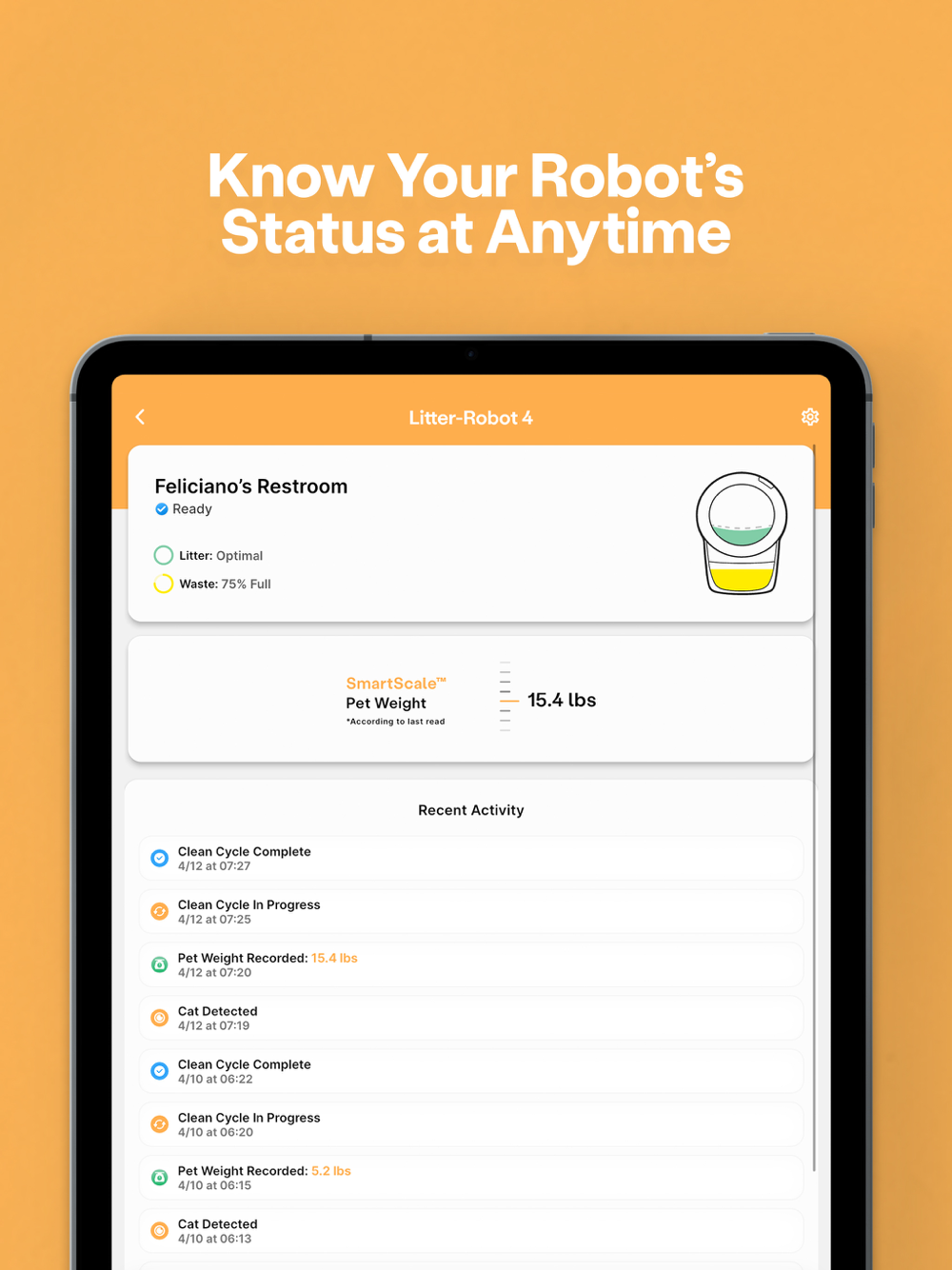 The Whisker Connect™ app allows you to remotely monitor and control your WiFi-enabled Litter-Robot unit(s) and Feeder-Robot unit(s) all in one place. This app brings you data about your cat’s litter box usage and your pet's feeding habits, giving you full control of your Litter-Robot 3 Connect, Litter-Robot 4, and Feeder-Robot right from your phone.