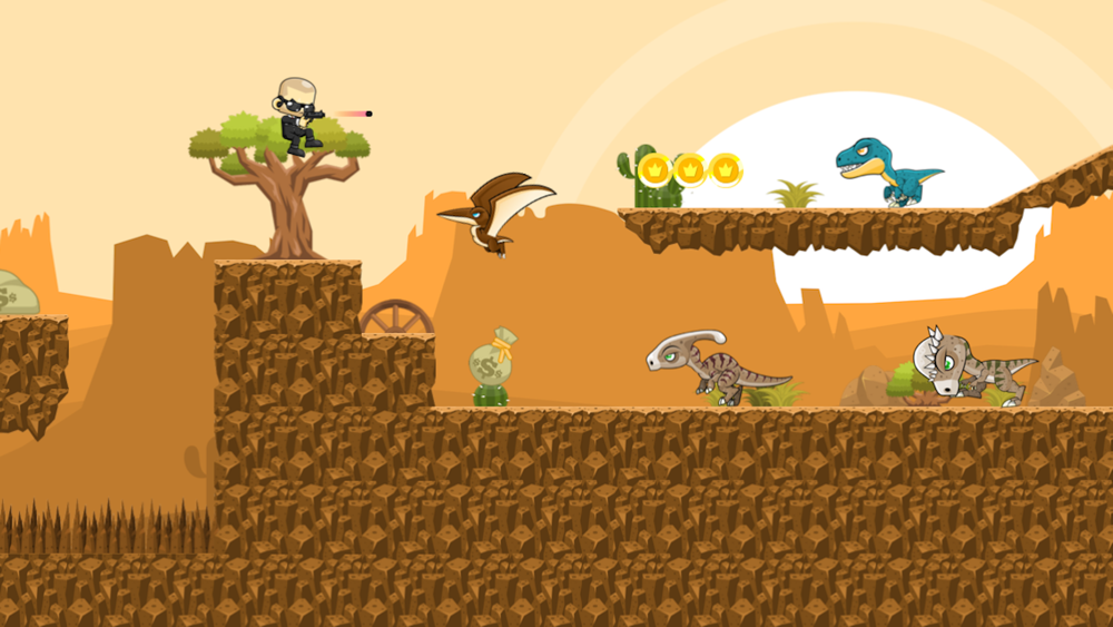 Run... jump... avoid... shoot... and collect coins to unlock cool characters, and save the world to complete all the missions full of dinosaurs and Golem Boss.