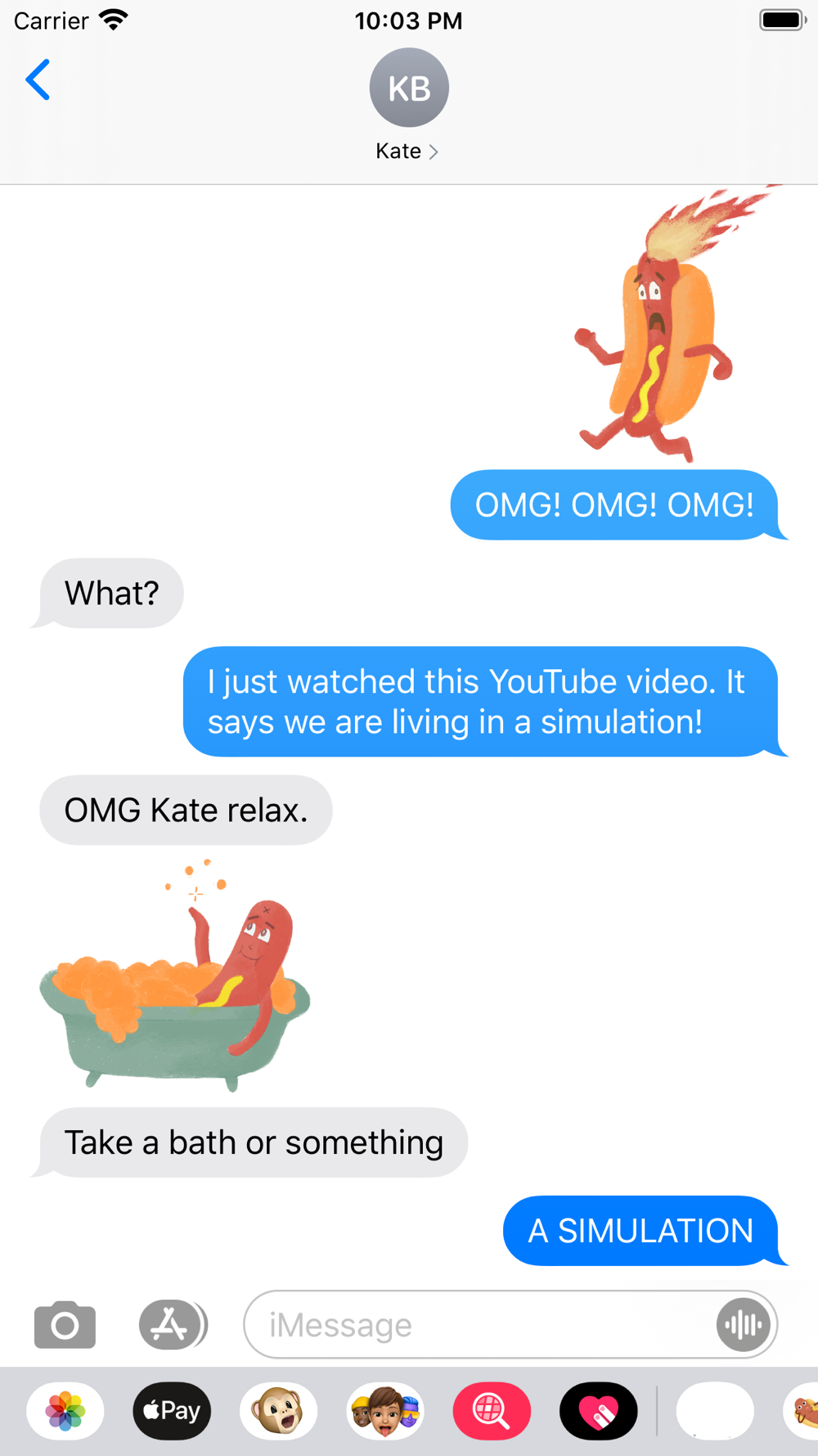 Enclosed in this sticker pack are 14 images of wacky cartoon hotdogs and sausages intended to comedically represent people. Each sticker was hand drawn and digitized using photoshop. Perfect for expressing yourself and making texts more interactive, all stickers come ready to send. Just tap or drag your desired sticker into a text stream and let the party begin.