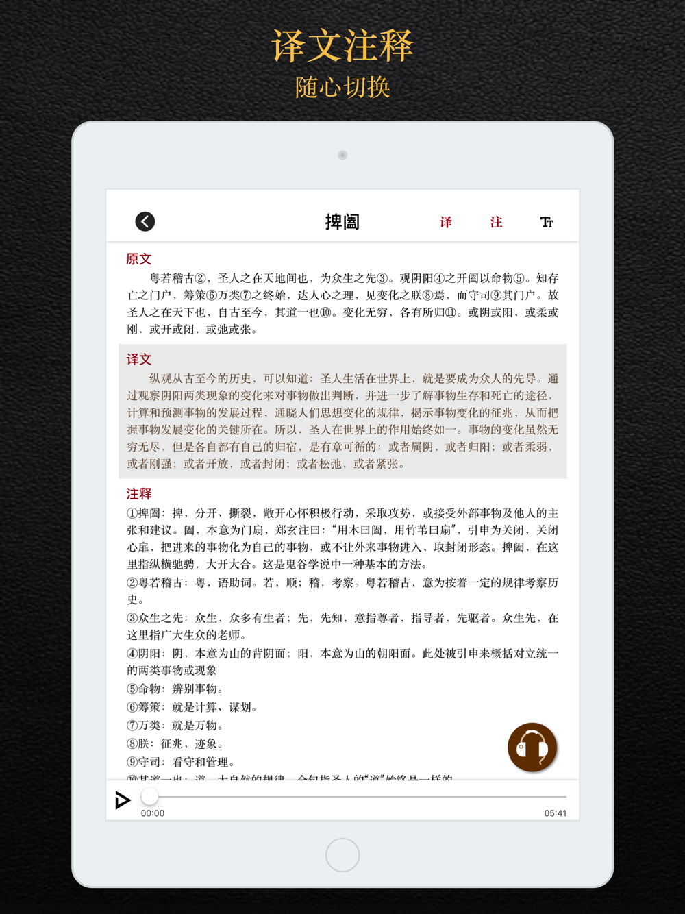 既有鬼谷子原文,又有注解和译文,更有优质朗读音频,实现了无障碍轻松阅读,是值得收藏研究的阅读佳品。