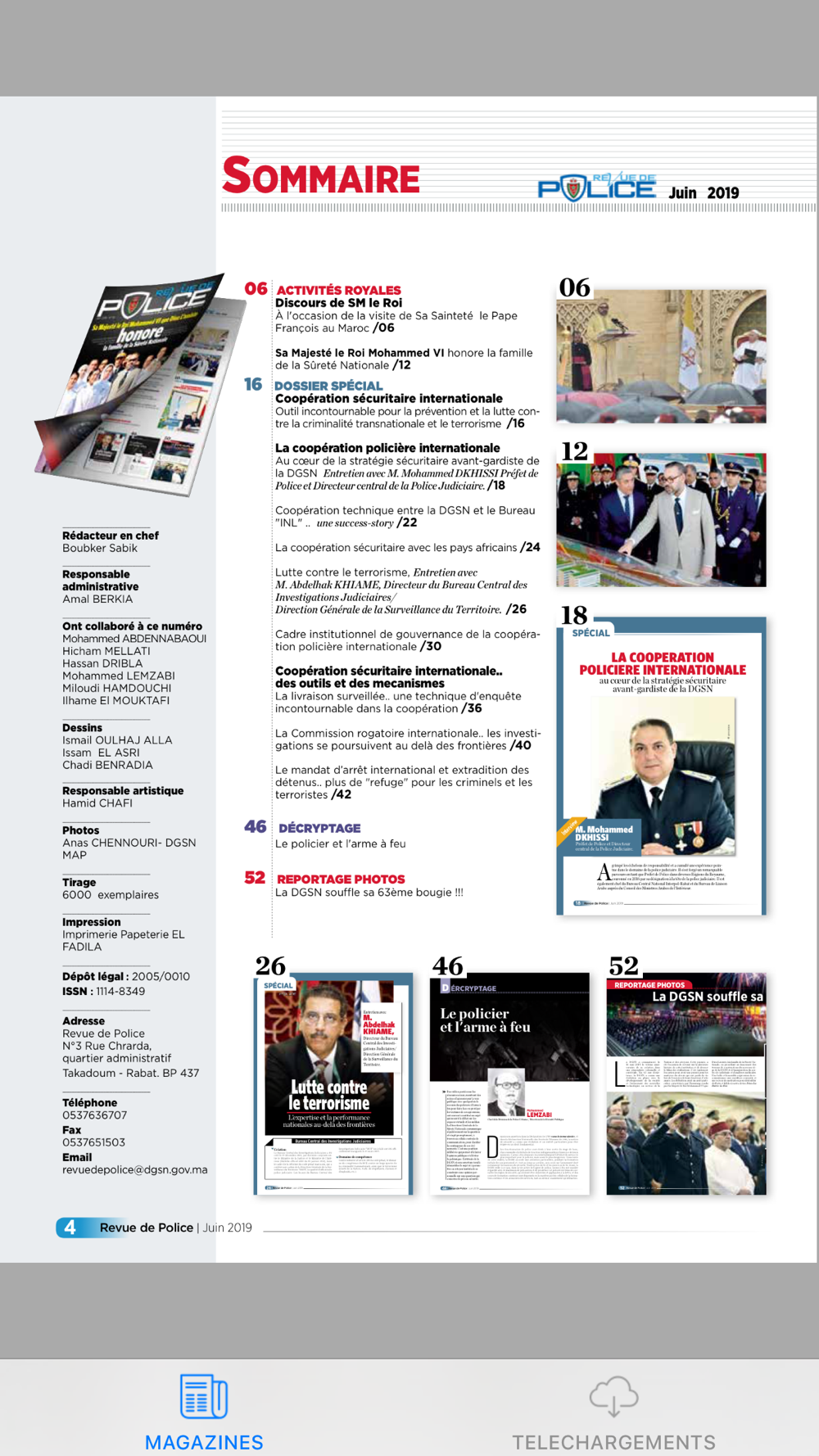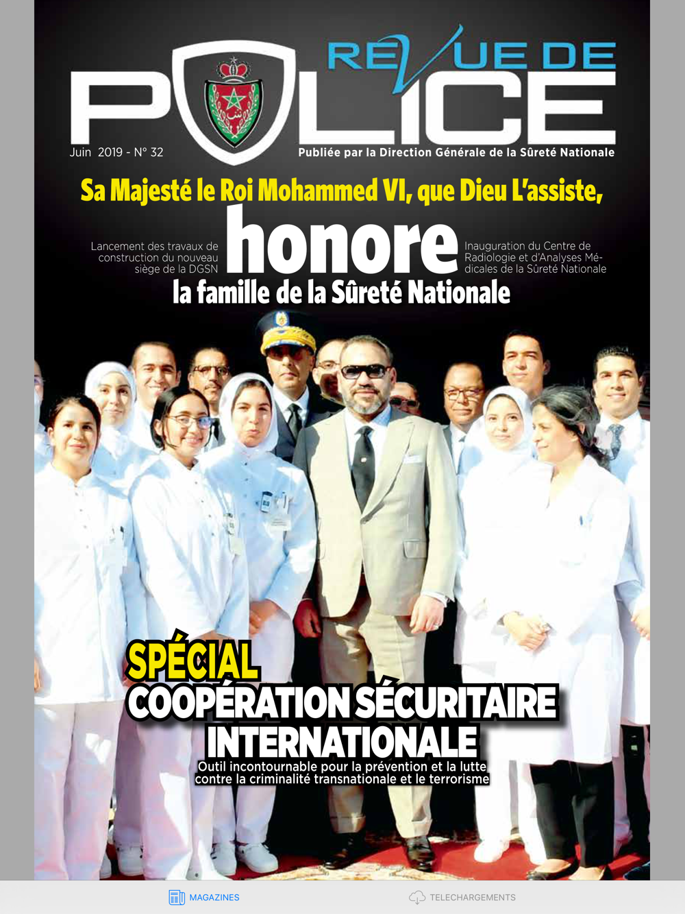 Une nouvelle application baptisée « Revue de Police » est désormais téléchargeable sur votre smartphone. Cette application embarque la version électronique de la Revue de Police qui constitue un support d’information et de communication institutionnelle, édité trimestriellement en langue arabe et française par la Direction Générale de la Sûreté Nationale,