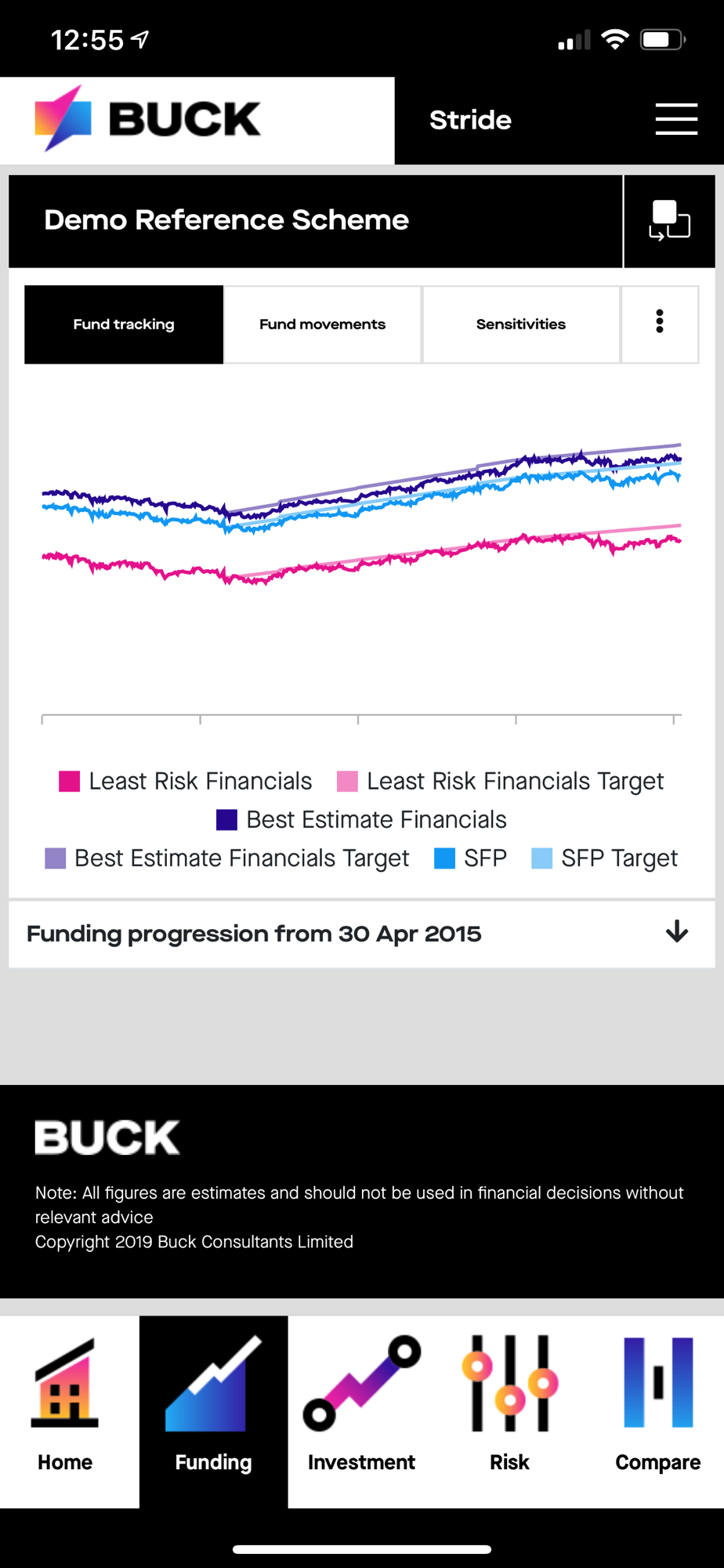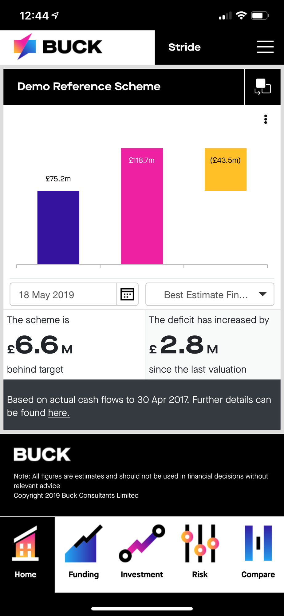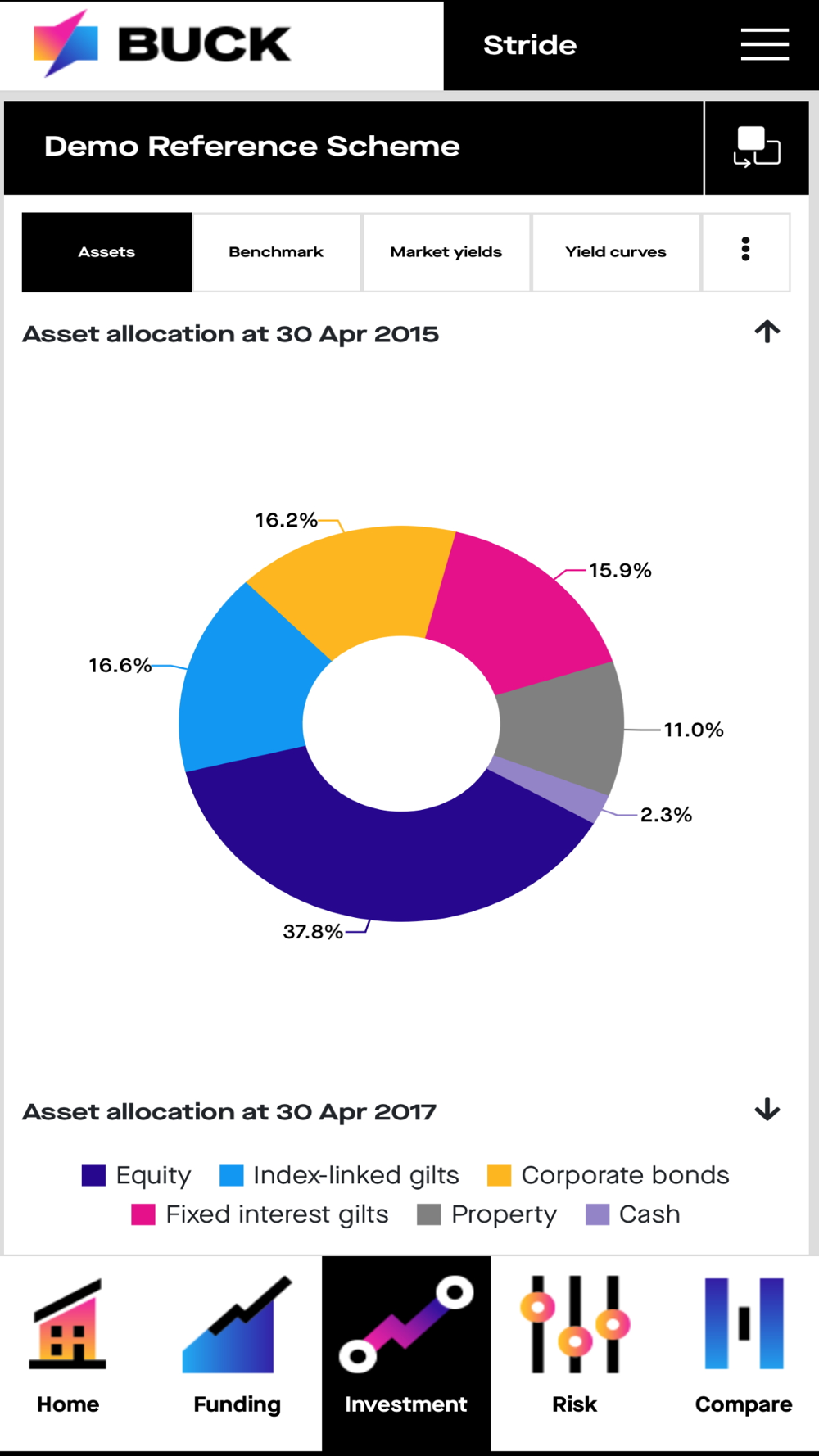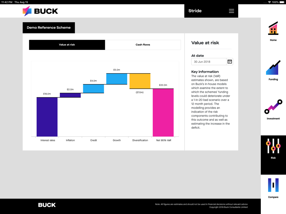Stride is Buck’s market-leading actuarial, investment and risk monitoring application for trustees and company sponsors of defined benefit pension schemes. It allows users to obtain an up-to-date, accurate assessment of pension scheme finances in a simple, clear and secure way, including sensitivity analysis, historical fund tracking, and the latest breakdown of assets.