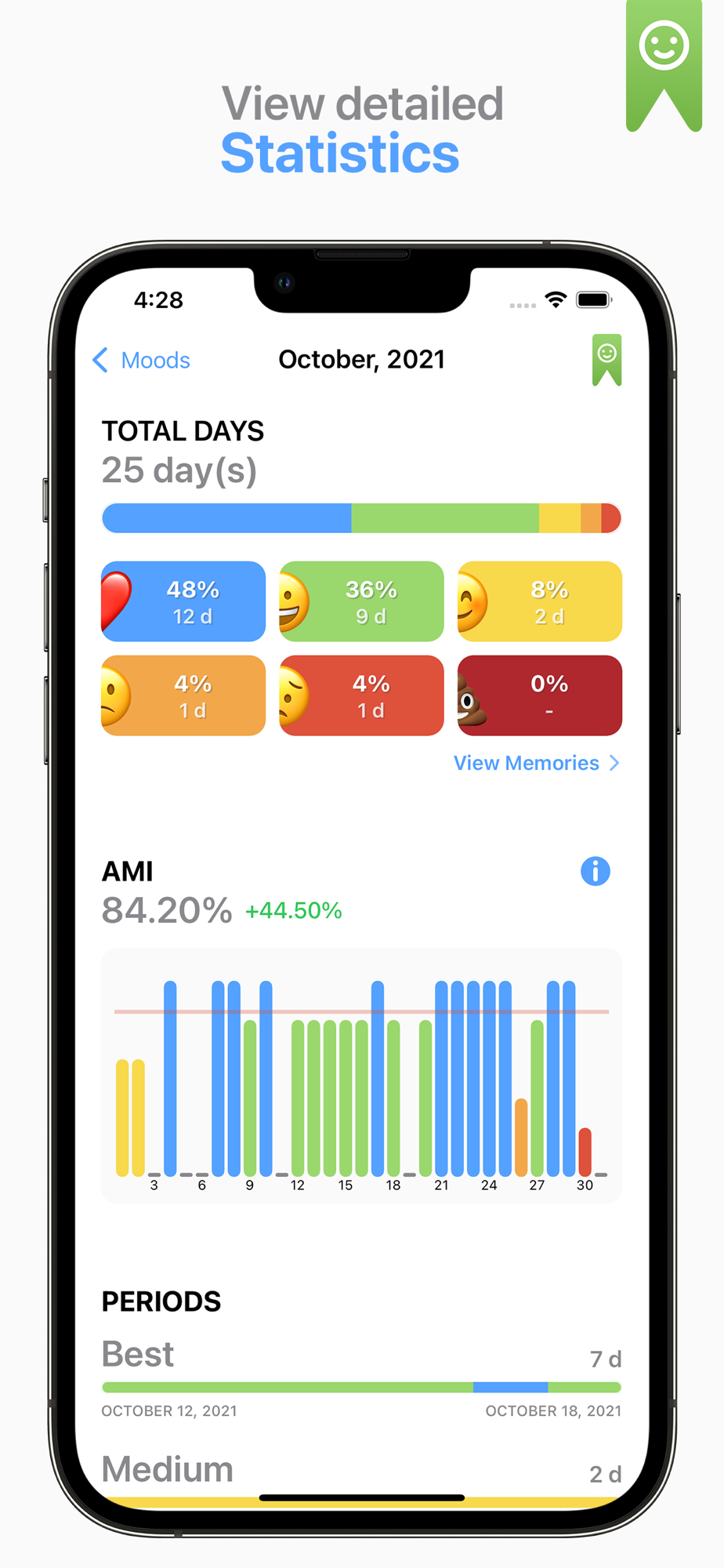Track your Mood history and view detailed statistics between different periods of time. Annual and monthly statistics are available.
