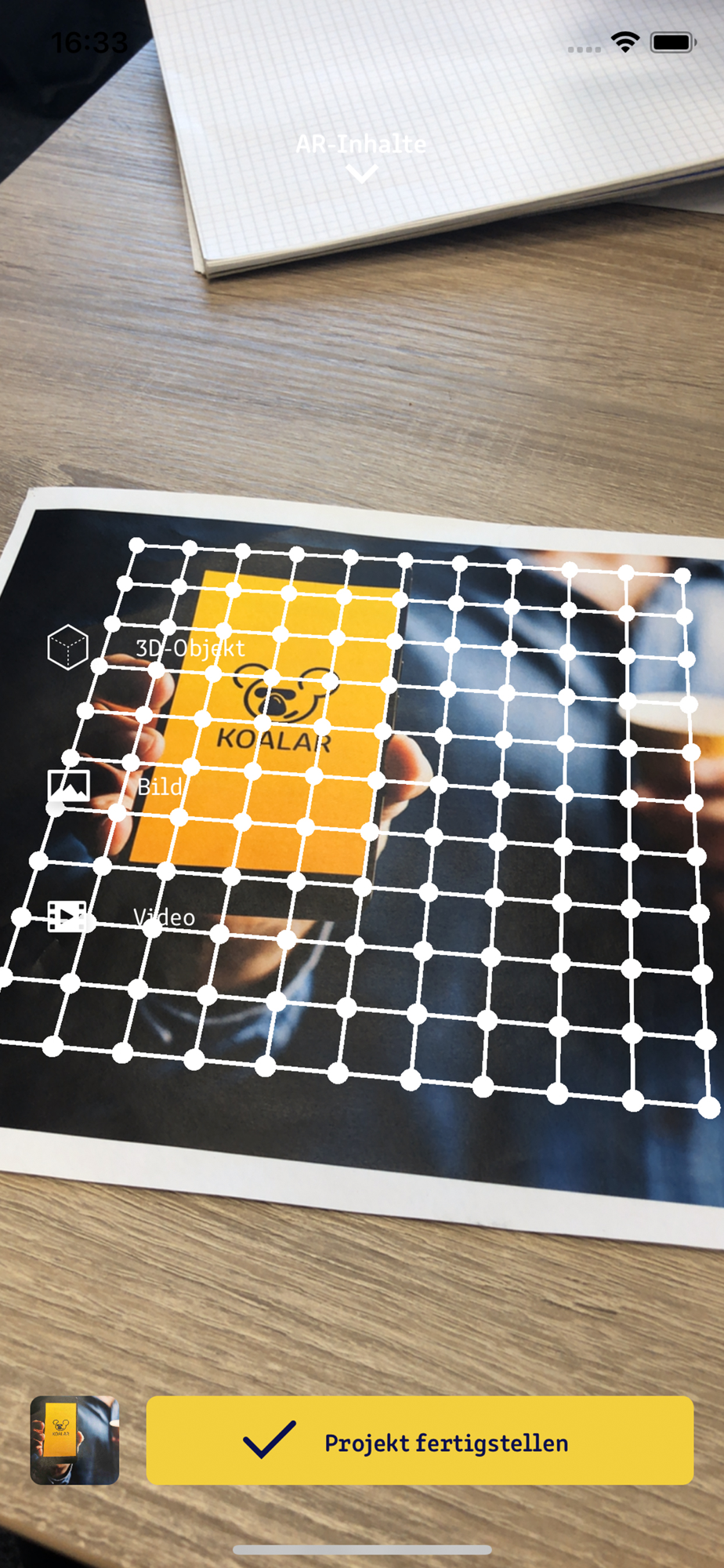 Durch KOALAR Create können Sie digitale Inhalte überall platzieren. Begeistern Sie Ihre Kunden mit Augmented Reality. Versehen Sie Ihre Printmedien mit mehr Informationen oder zeigen Sie Kunden direkt ein real wirkendes Modell eines Produktes.