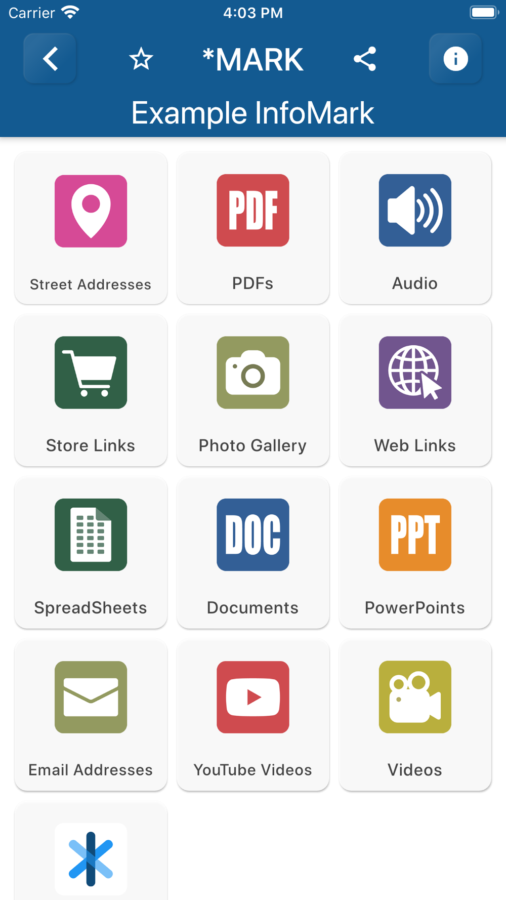 To begin, install the app and create a new InfoMark to share files and information with friends, students, businesses and more. You can add your InfoMarks to product labels, business cards, blogs, websites, or any other text. Others can then look up your InfoMark and reference any information which you designate as relevant.