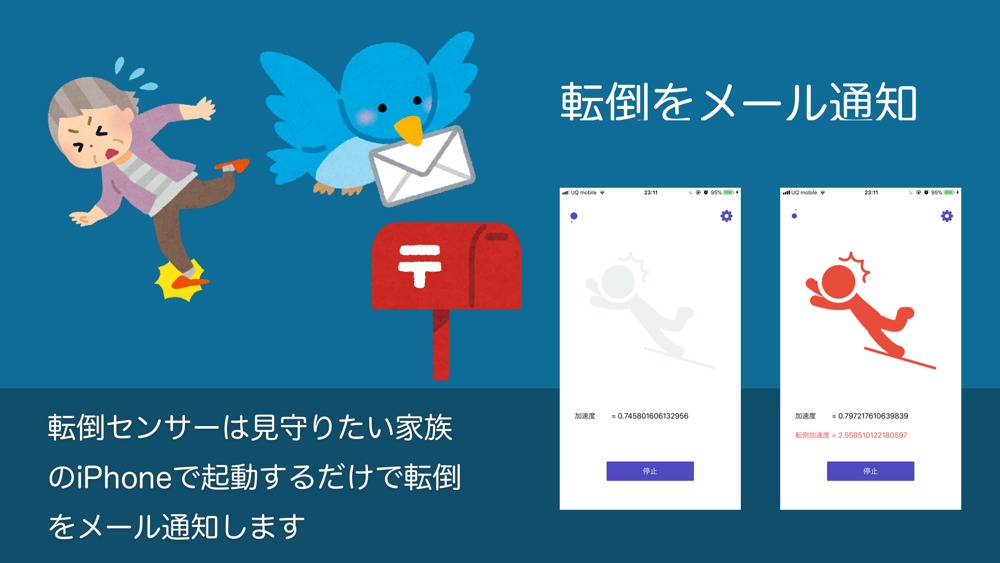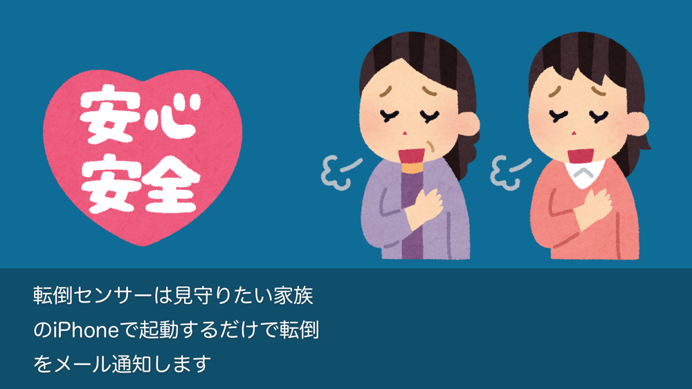 小さなお子様やご年配のご両親がもし転倒してしまったらご家族はいちはやくそれを知りたいですよね。本アプリをお子様やご両親のiPhoneにインストールして起動しておけば、転倒があった際メールで通知します。