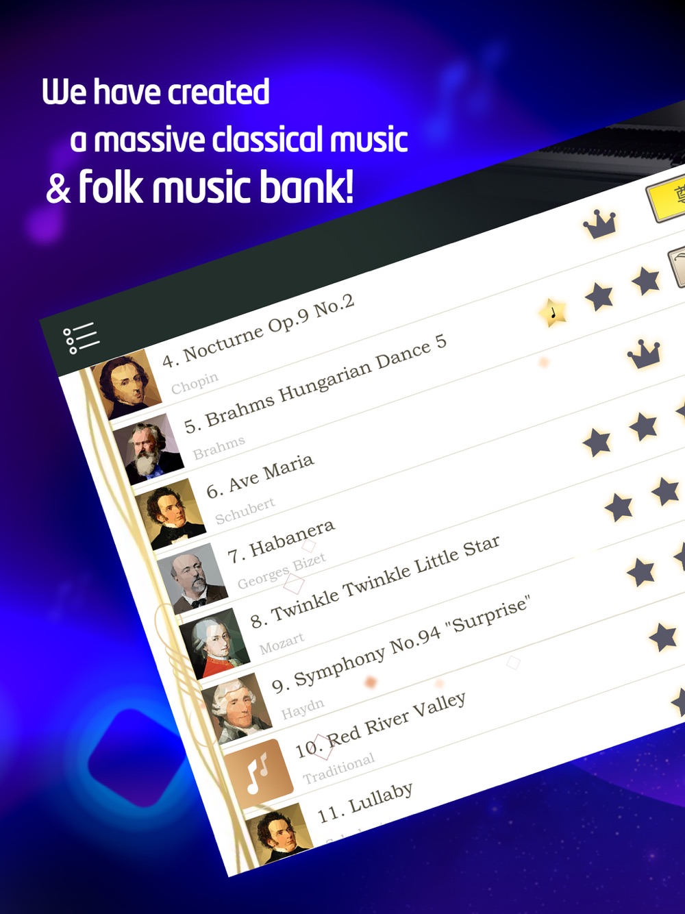Experience the beauty of the piano in the semi-teaching game with music in the classical and folk genre.
