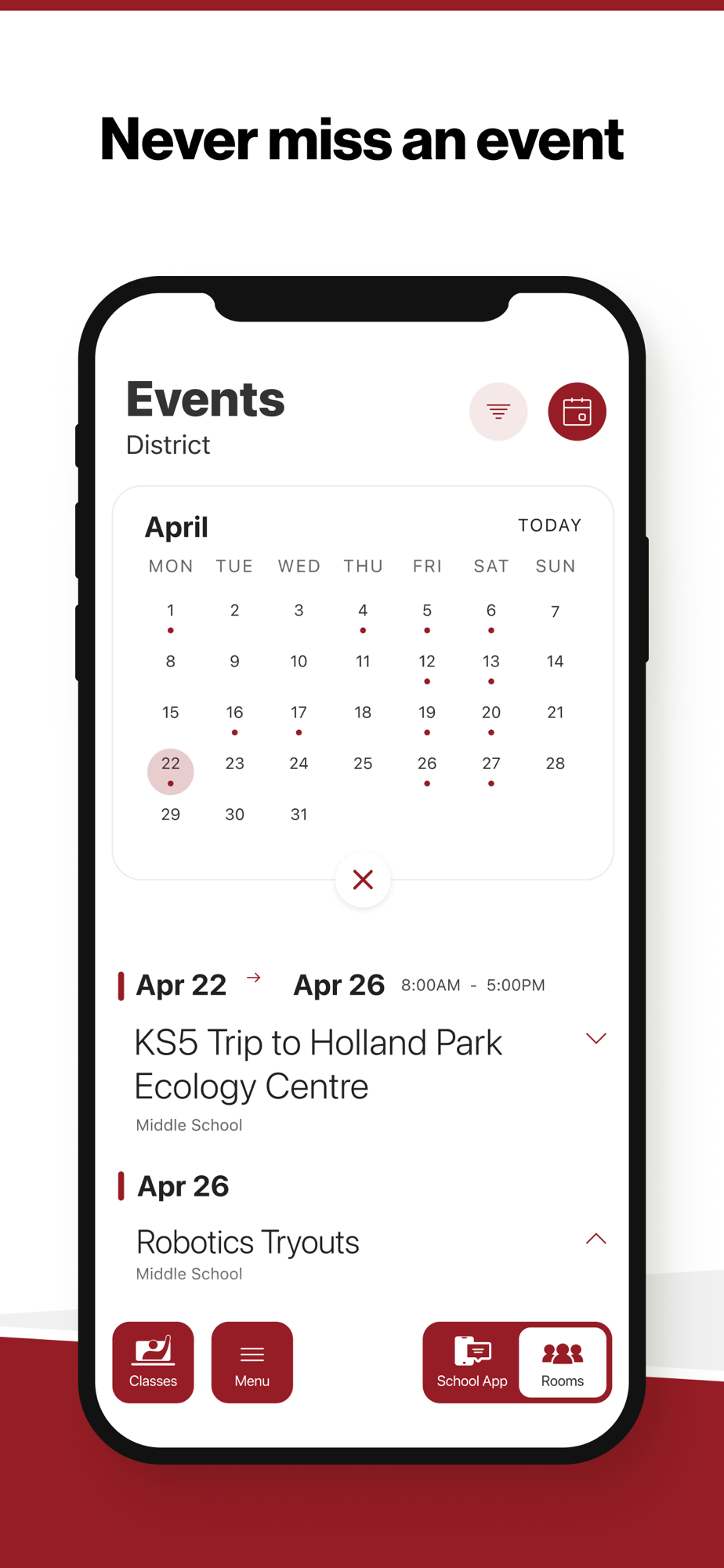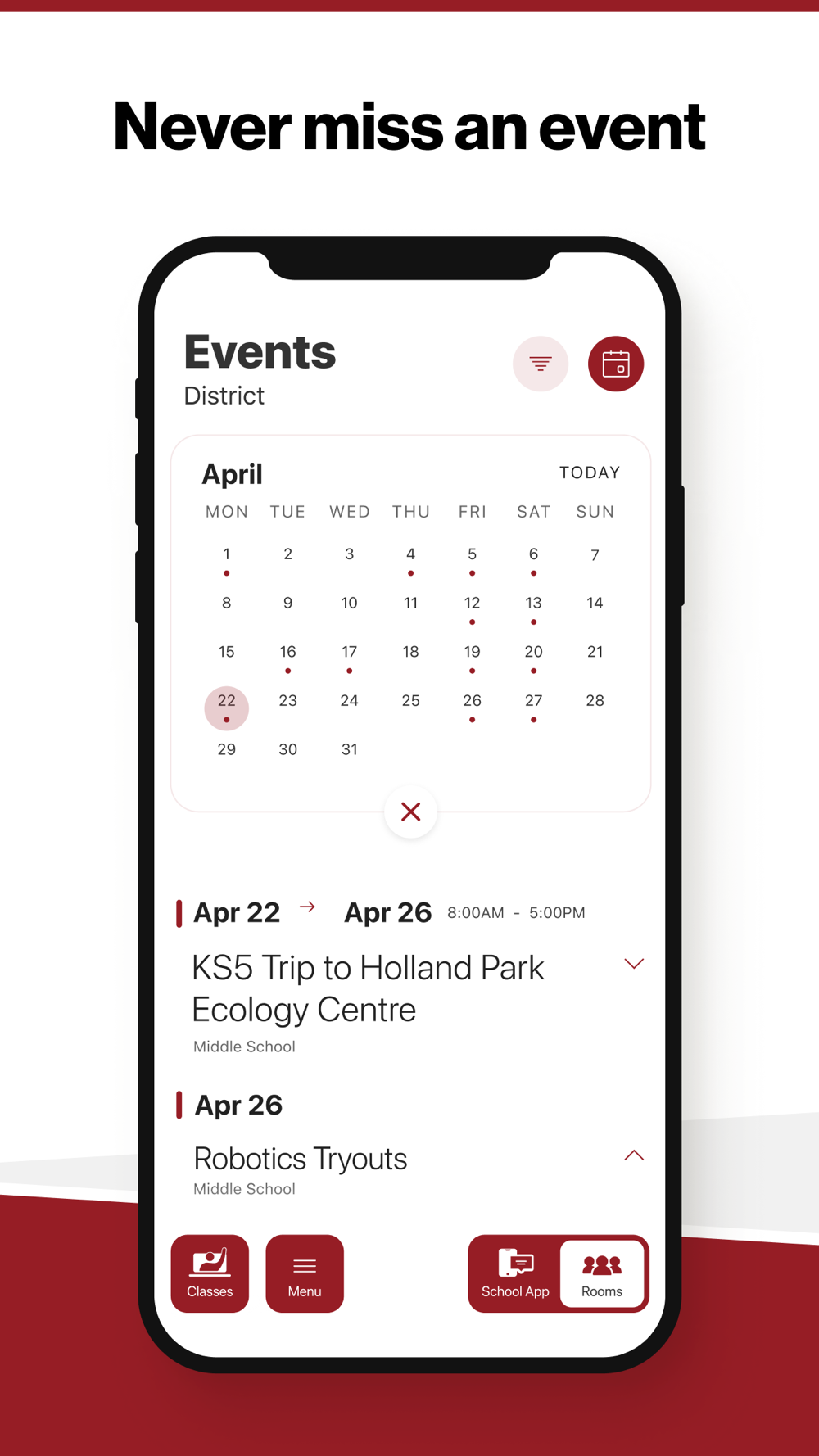 The event section shows a list of events throughout the district. Users can add an event to your calendar to share the event with friends and family with one tap.