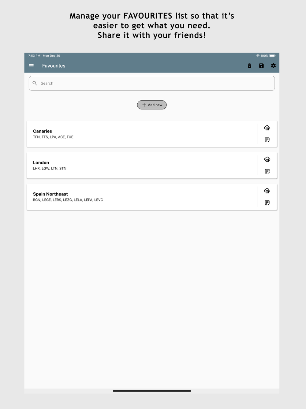 - Create a favourites list, so that it's easier to group your destinations, alternates, areas or routes and get the information without typing again all of them. Also, you can backup and share your list with a friend or import one!