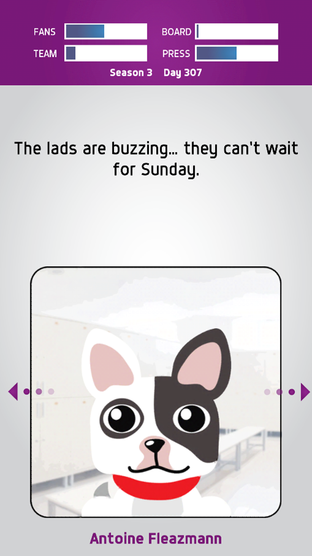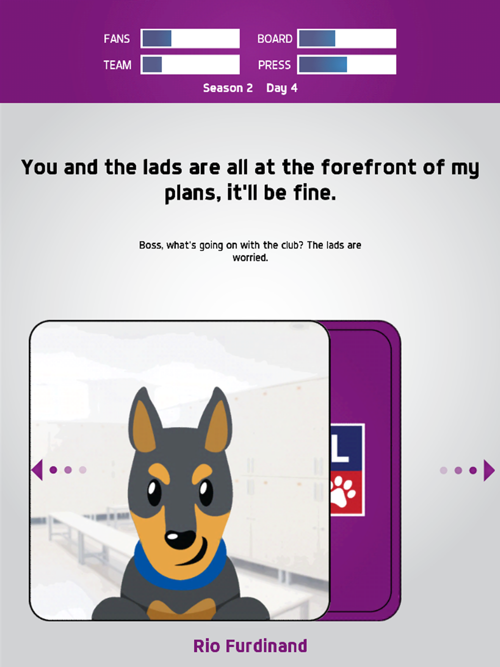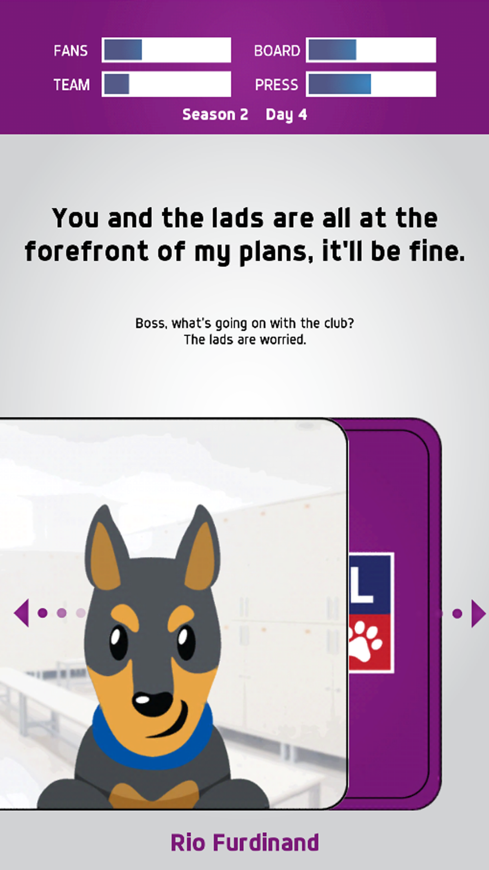 Take the job of managing one of the world’s biggest clubs, or work your way up with a team of waifs and strays more used to relegation dog fights – the choice is yours! Whether it's dealing with terrible VAR decisions, rogue players or greedy agents, Woofball Manager is a ‘choose your own adventure’ game where you run the show. Make all the key decisions via a card dragging mechanic – simply move the card left or right to see your choice of answers and then let go to select.