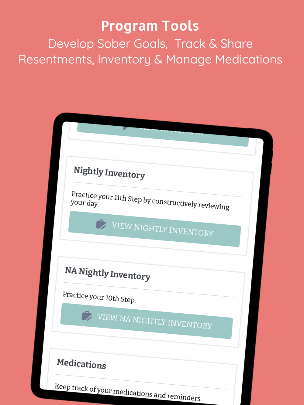 -Program and recovery maintenance tools. Keep track of Goals to help you keep a sober lifestyle. Keep track of Resentments (4th Step). Spotcheck Daily Inventory & Nightly Inventory (10th Step). Keep track of your Medications.