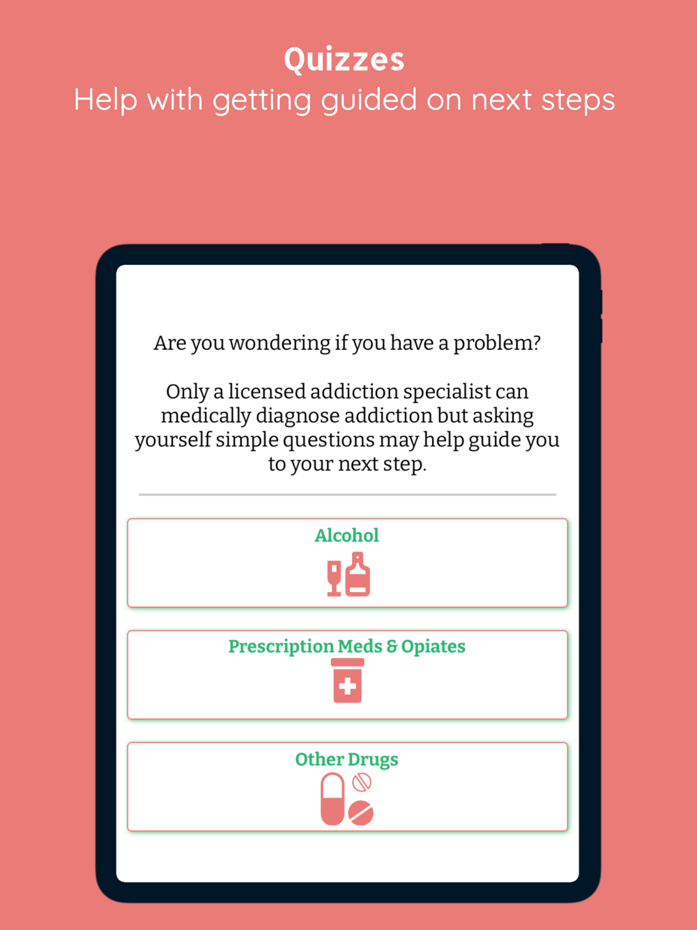 -Take a screener to help gauge next steps in the early recovery process. RESULTS ARE SAVED DIRECTLY ON YOUR DEVICE - NOT WITH US - SIMPLY CLOSE THE APP TO DELETE SCREENER ANSWERS AND RESULTS.