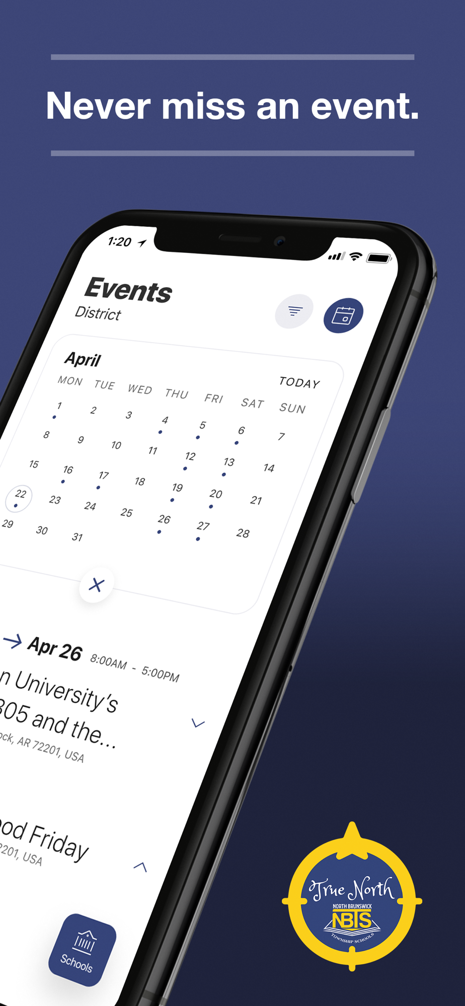 The event section shows a list of events throughout the district. Users can add an event to their calendar to share the event with friends and family with one tap.