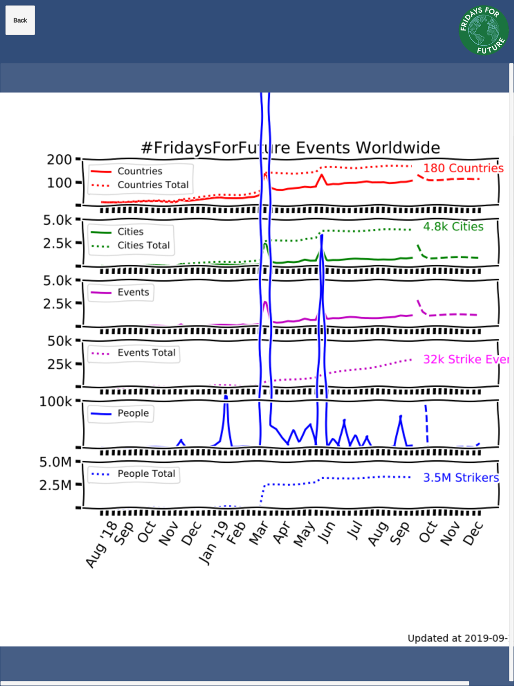 Fridays For Future (FFF) is the movement started by Greta Thunberg when she sat down in a school strike front of the Swedish parliament building on August 20, 2018. Since then, strikes supporting the cause have been happening in nearly 200 countries, several thousand cities, in tens of thousands individual events with millions of strikers. You can follow the daily updates to these stats in this app.