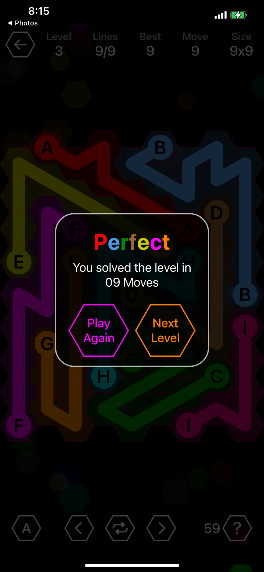 The Puzzle is solved when all Hexas Lines are created and the whole board is filled.
