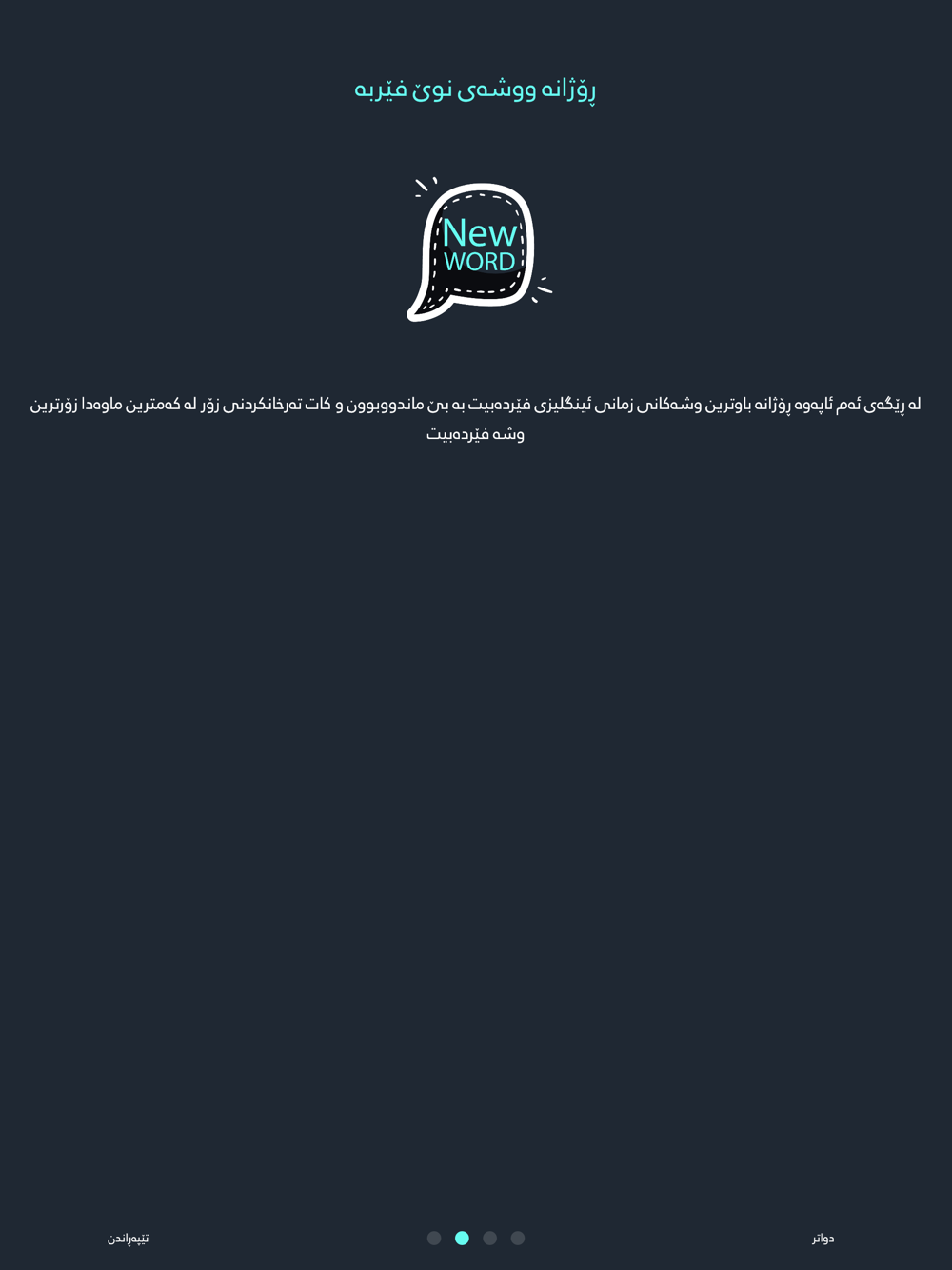 لە ڕێگەی ئەم ئاپەوە دەتوانن ڕۆژانە باوترین وشەو ڕستەو دەستەواژەکانی زمانی ئینگلیزی فێر ببن بە ئاسانترین شێوە کە پێویستی بە هیچ سەعی کردن و لەبەر کردنێک نەبێت و تەنها بە چەند جار دووبارە کردنەوەیەکی ڕؤژانە دەتوانن هەموو وشەو دەستەواژەو ڕستەکانی ناو ئەم ئاپە فێر ببن کە پێتان دەگات.