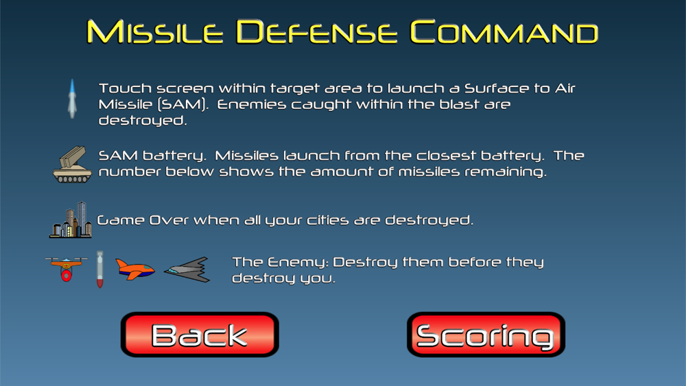 Inspired by classic arcade gaming. Save your cities from incoming missiles by blowing them out of the sky! Easy touchscreen controls for exciting action.