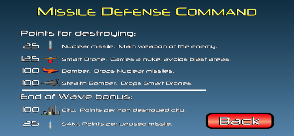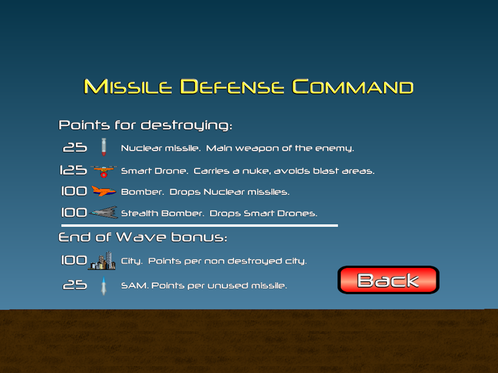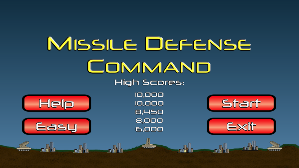 Easy/Normal/Hard difficulty levels - each with their own separate Highscore list.Missile count now in big red numbers when low.Other minor improvements.