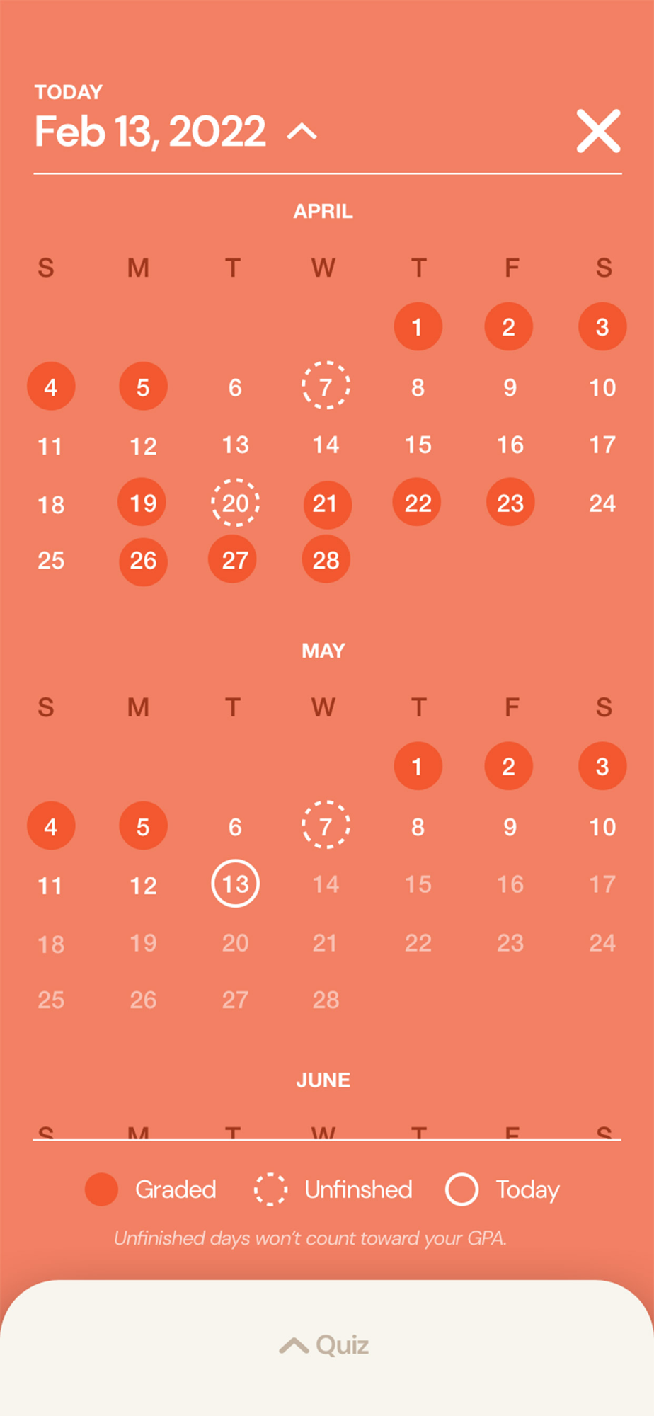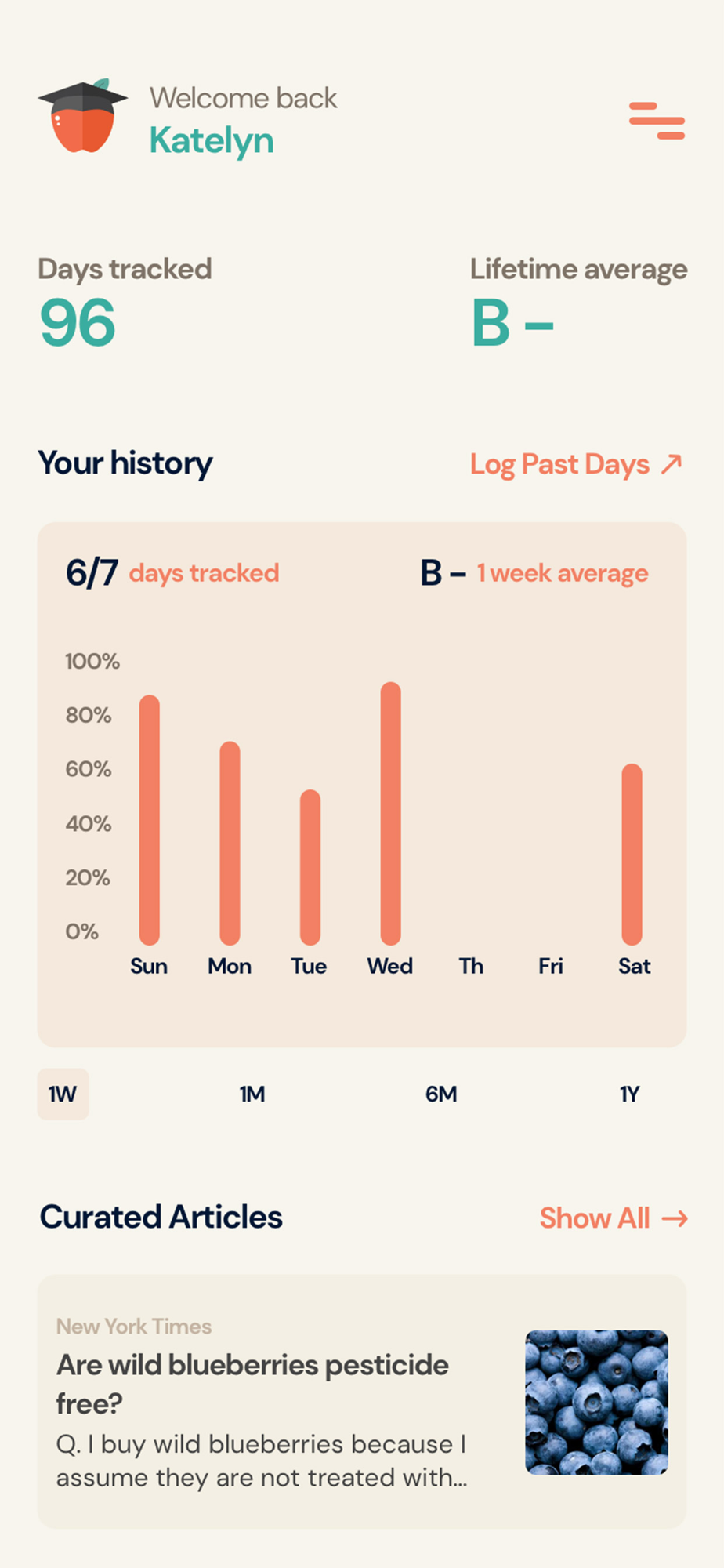 Every day, answer ten "yes" or "no" questions about what you ate that day and get instant nonjudgmental feedback on the quality of your diet, along with clear direction on how to improve your eating habits and nutrition. Then, watch your Nutrition GPA improve over time! It’s easy, fun, and effective. It’s also backed by decades of nutrition science and research.