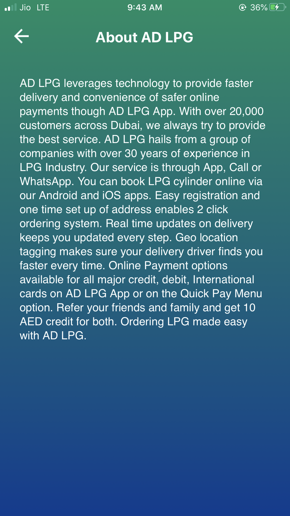 AD LPG is Among Top Gas Companies in Dubai. The app provides online solutions to book LPG Cylinders all across Dubai. We provide hassle-free, instant delivery of Gas Cylinders. This user-friendly app helps you with one-tap ordering, live tracking and easy delivery of LPG gas cylinders at your doorstep by the delivery agents via GPS. Place your cooking gas orders and get delivered instantly within 20 minutes. Payment can be made either through credit card, online or by cash at the delivery time. Secure online payments with Network International. Geotagging facilitates faster delivery. Experience less waiting time and faster delivery with AD LPG. Get the best gas cylinder price in Dubai and other benefits and offers with the app. Referral rewards of 5 AED.