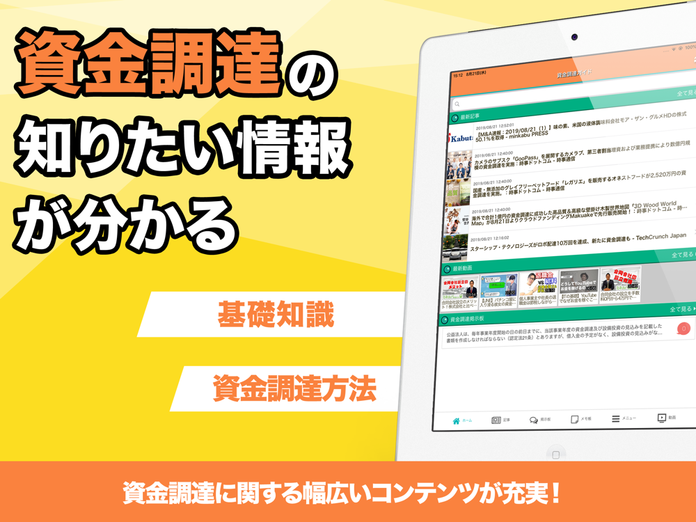 資金調達に必要な基礎知識、ノウハウ、お役立ち情報などがこのアプリ1つで全て網羅!