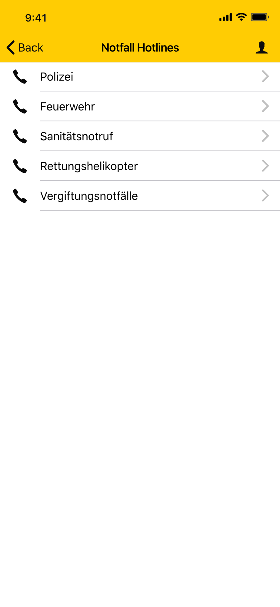 Notfall Hotlines von Polizei, Feuerwehr, Sanitätsnotruf, Rettungshelikopter, Vergiftungsnotfälle