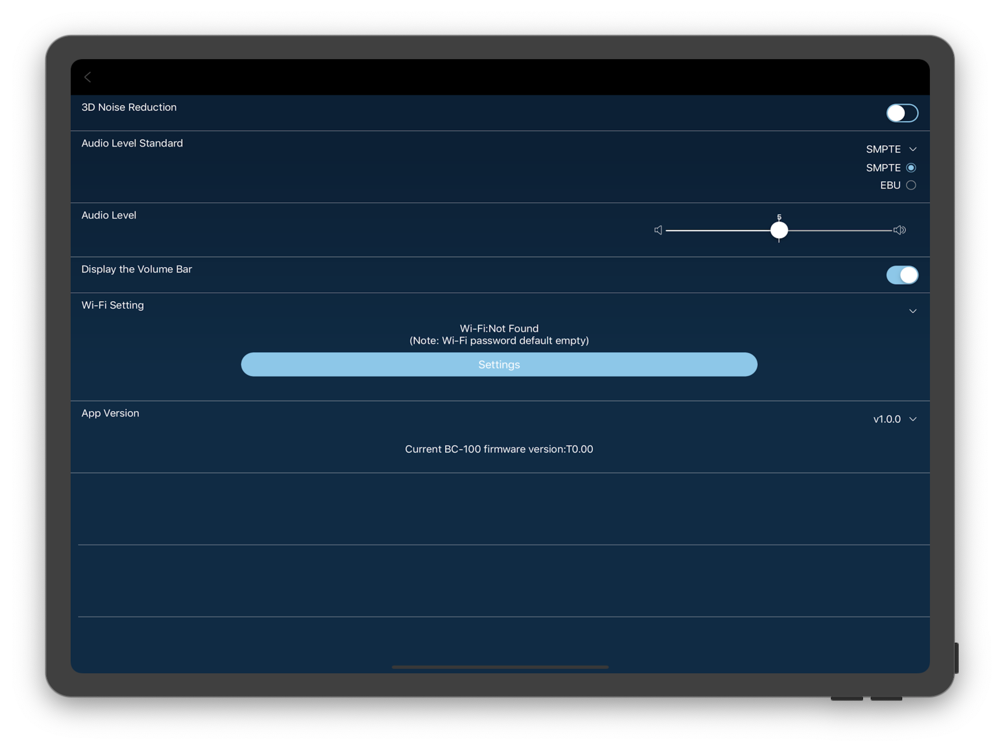 This BC-100 app is designed to fully control Datavideo professional camera: BC-100 “Interchangeable Lens Camera”. While connecting the mobile device with BC-100 camera through USB or Wifi (optional) connection, user may control the full function of BC-100 camera, and also get the preview image on the mobile device. The professional UI design keeps all the necessary information on the top layer, and user may easily control and adjust any parameter while monitoring the result on the mobile device.