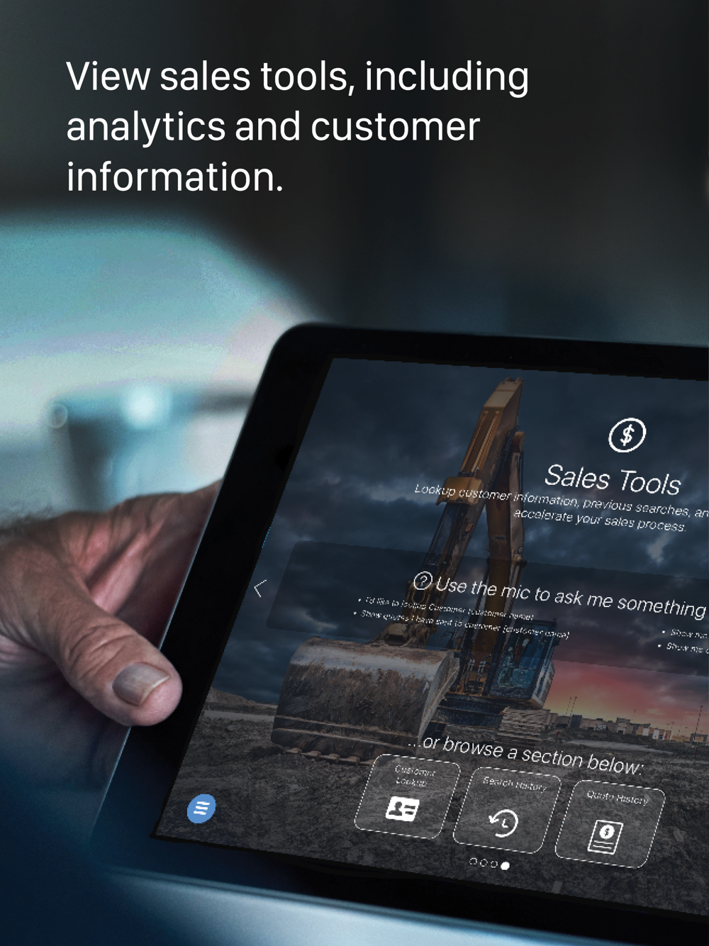“Here you go!” Configure price and quote compatible attachments on-command with virtual agent voice technology. Seal the deal by sending an accurate quote on the spot. Automatically flip to the information you seek in documents and manuals.