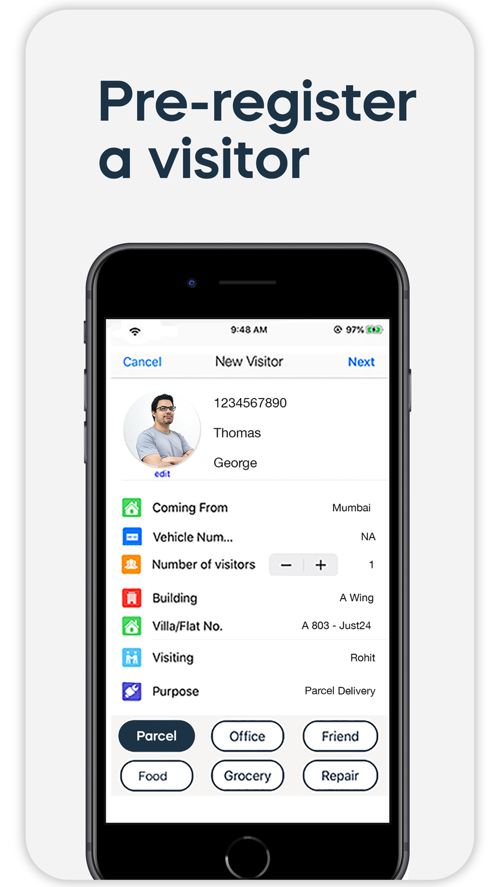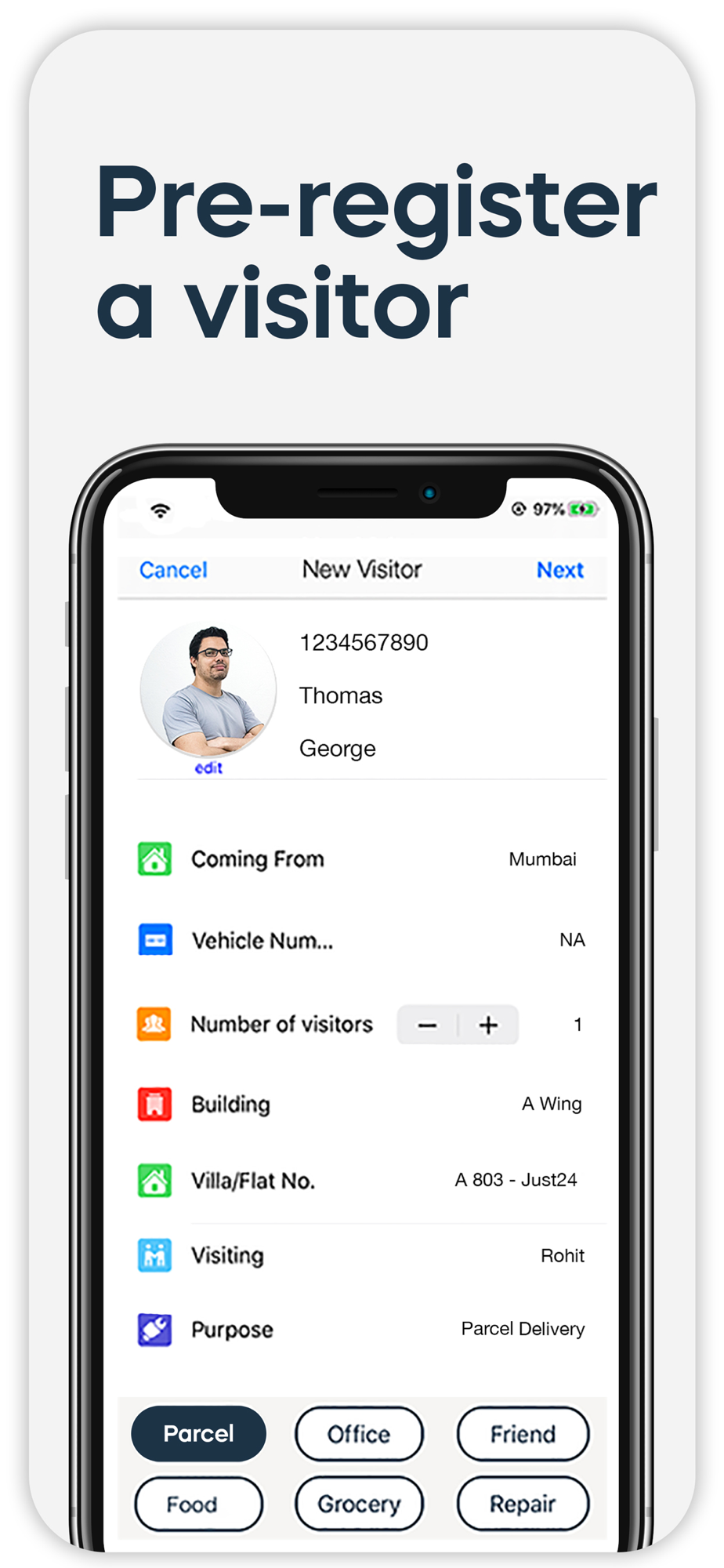 A Visitor management App that lets you manage the visitors coming to your residential premises, gated community or business / workplace.