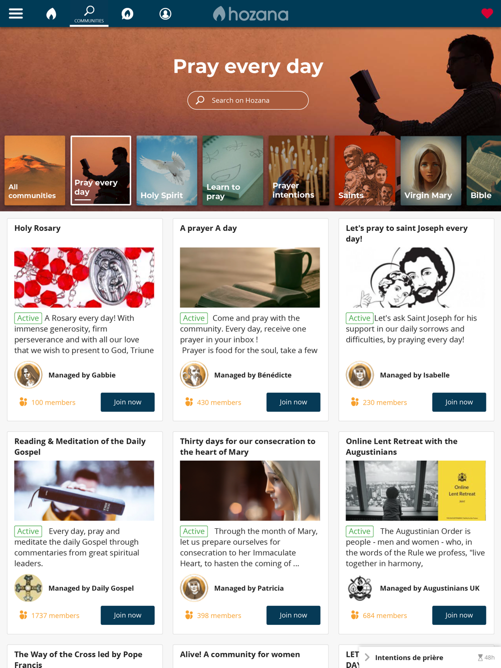 Discover hundreds of prayer communities around various spiritual themes on the Hozana app. Let us help you grow your prayer life every day of the year!