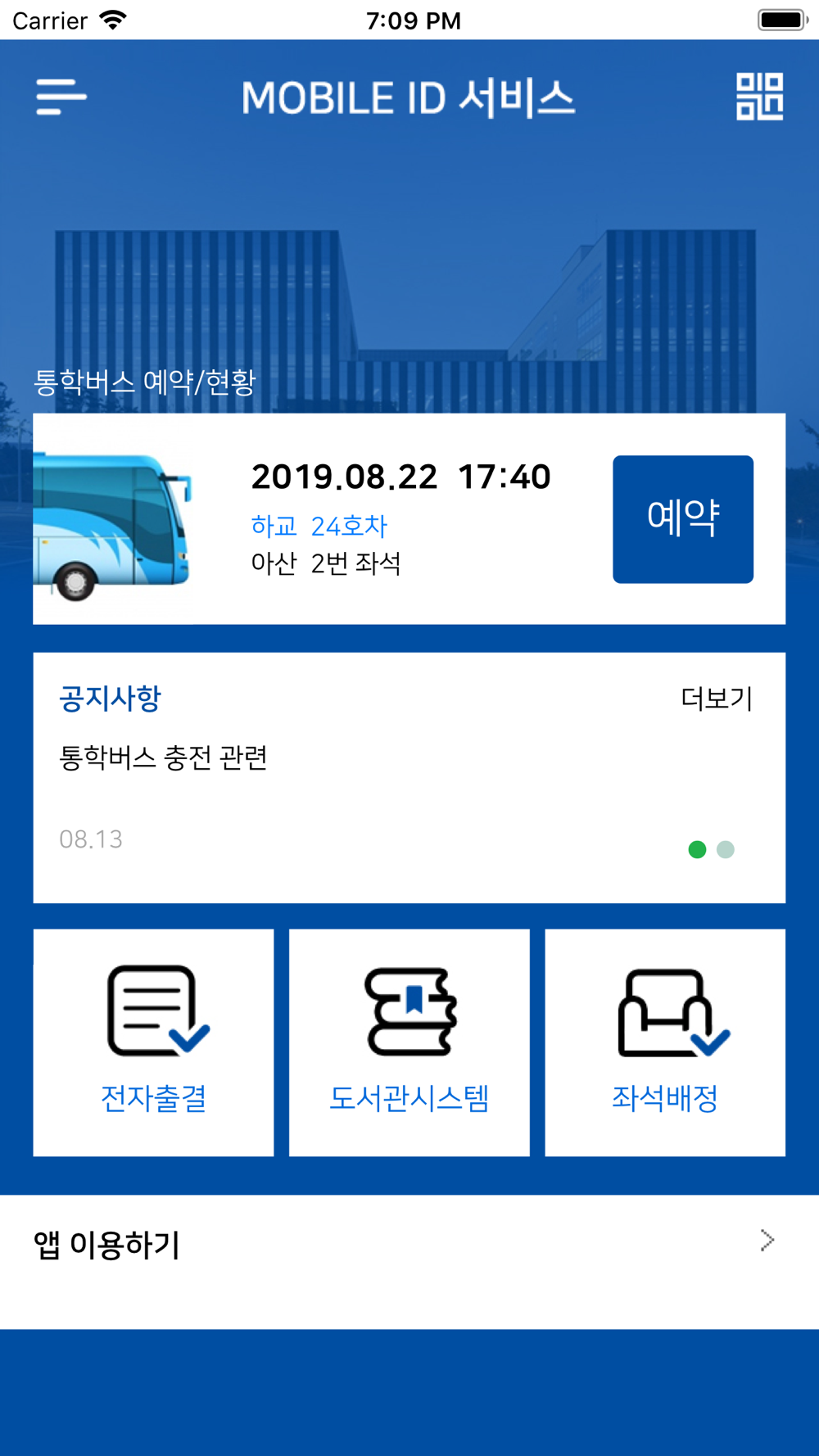 - 도서관 게이트 출입, 유/무인 대출 및 반납, 열람실 무인좌석 발급 키오스크에서 모바일학생증(QR/NFC)으로 편리하게 이용