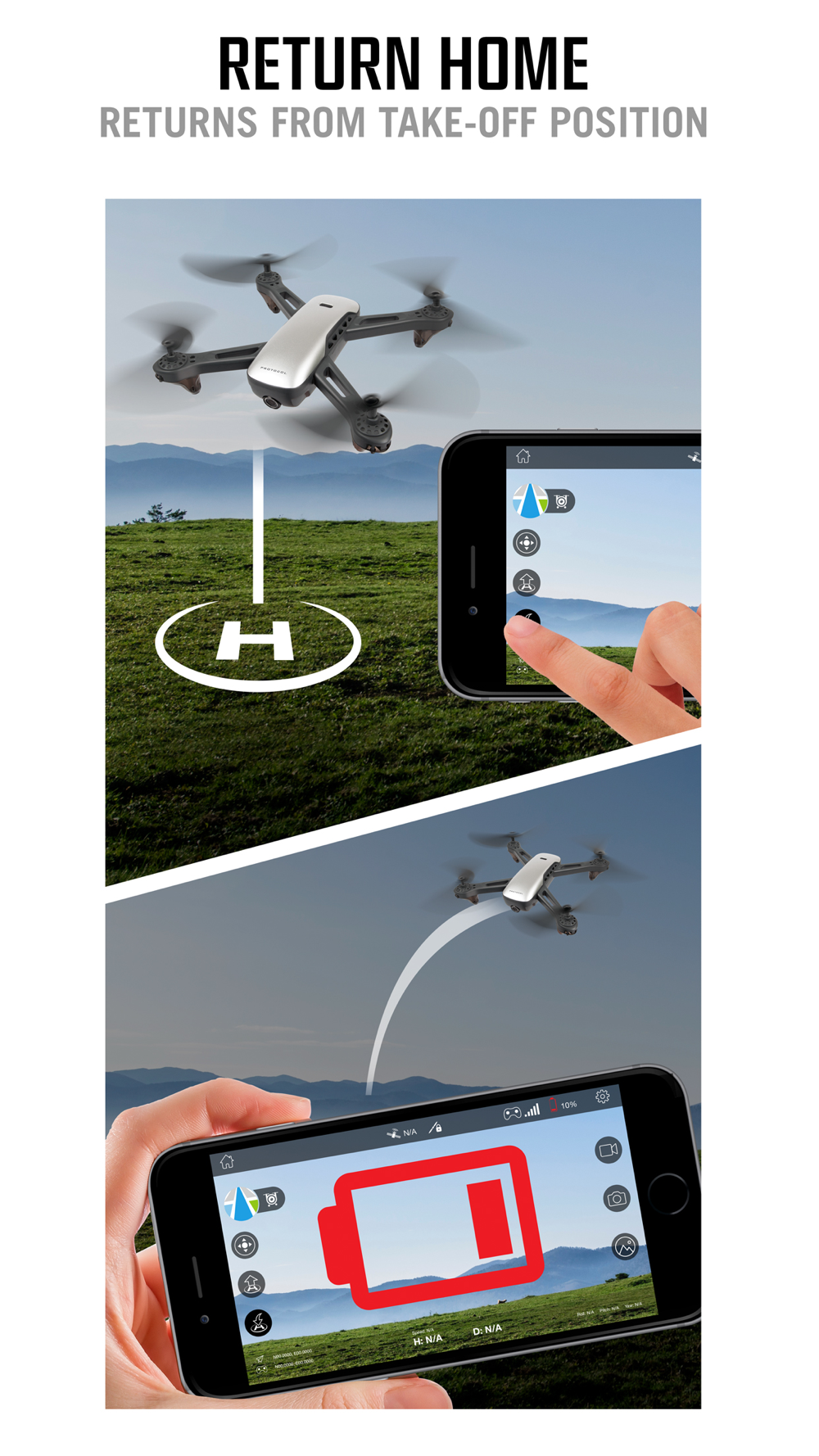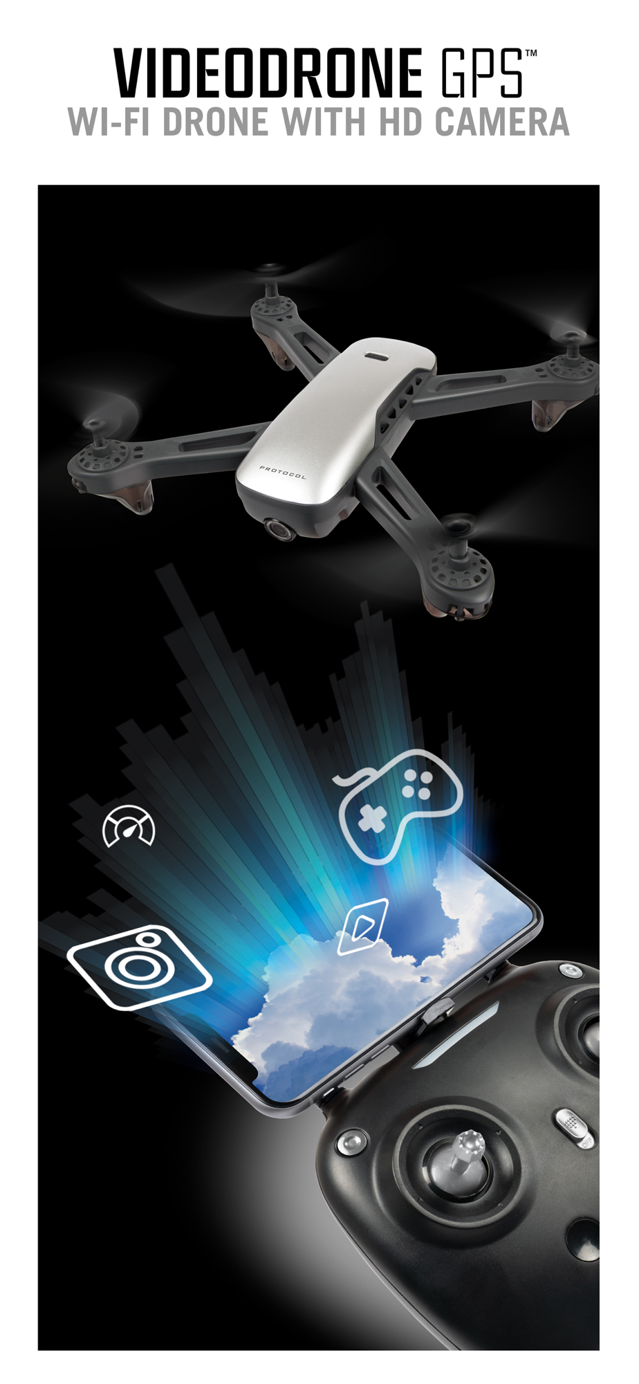 App connects smartphones and tablets to Protocol’s VideoDrone GPS via drone’s built-in Wi-Fi signal. Functions include: