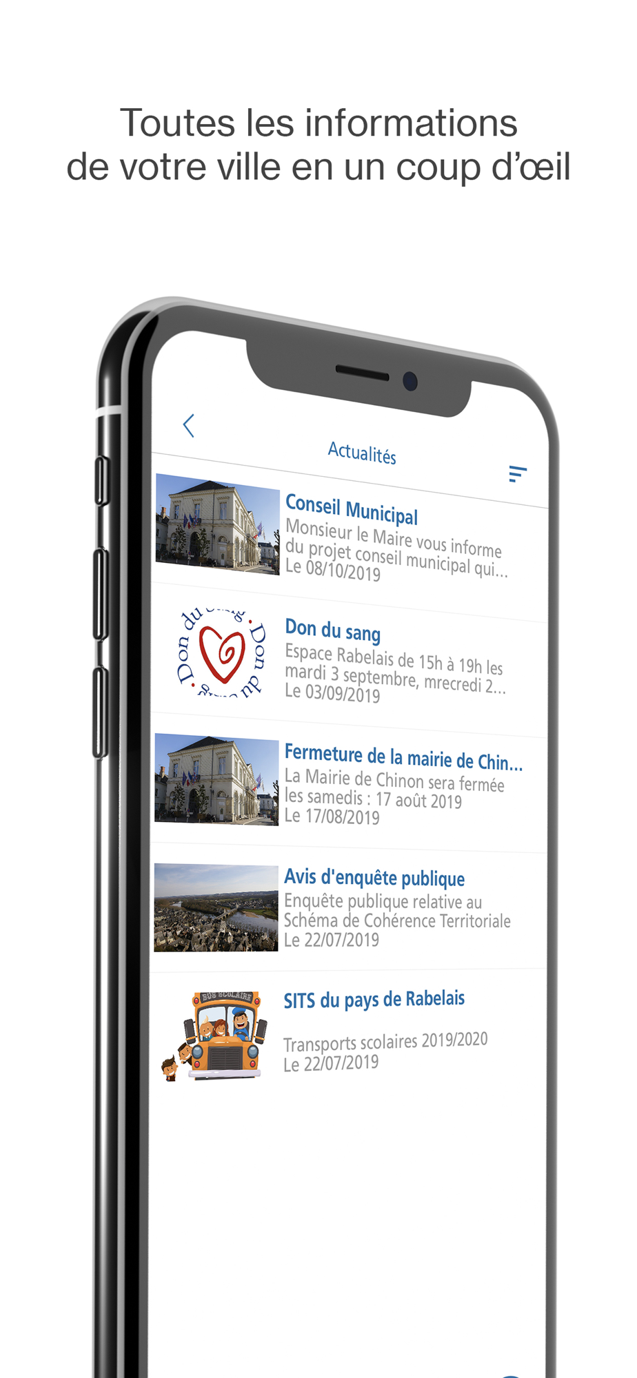 L'application de la ville de Chinon vous propose les actualités, l'agenda des manifestations, les numéros utiles des services de la mairie, des notifications en temps réels et bien plus encore... : restez connecté avec votre ville !