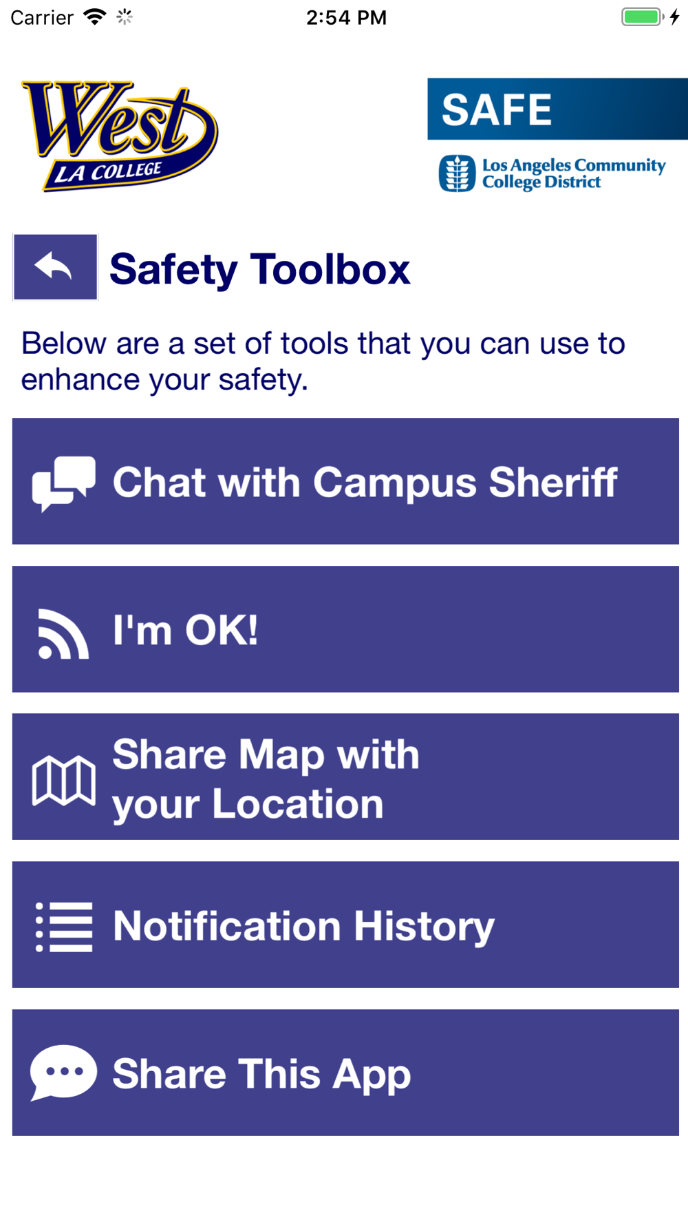 WEST SAFE is the official safety app of West Los Angeles College. It is the only app that integrates with WLAC's safety and security systems. West Los Angeles College Sheriff Department has worked to develop a unique app that provides students, faculty and staff with added safety on the WLAC campus. The app will send you important safety alerts and provide instant access to campus safety resources.
