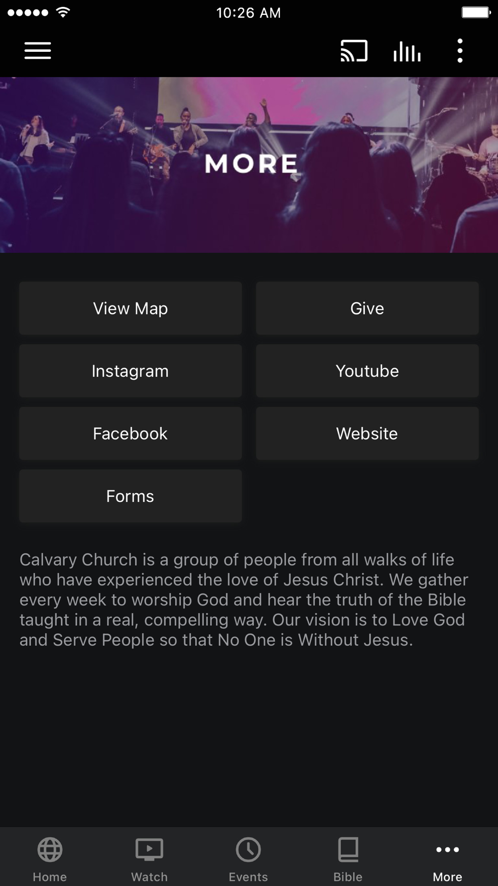 Calvary Church is a group of people from all walks of life who have experienced the love of Jesus Christ. We gather every week to worship God and hear the truth of the Bible taught in a compelling, challenging way. We are committed to Loving God and Serving People so that No One is Without Jesus.