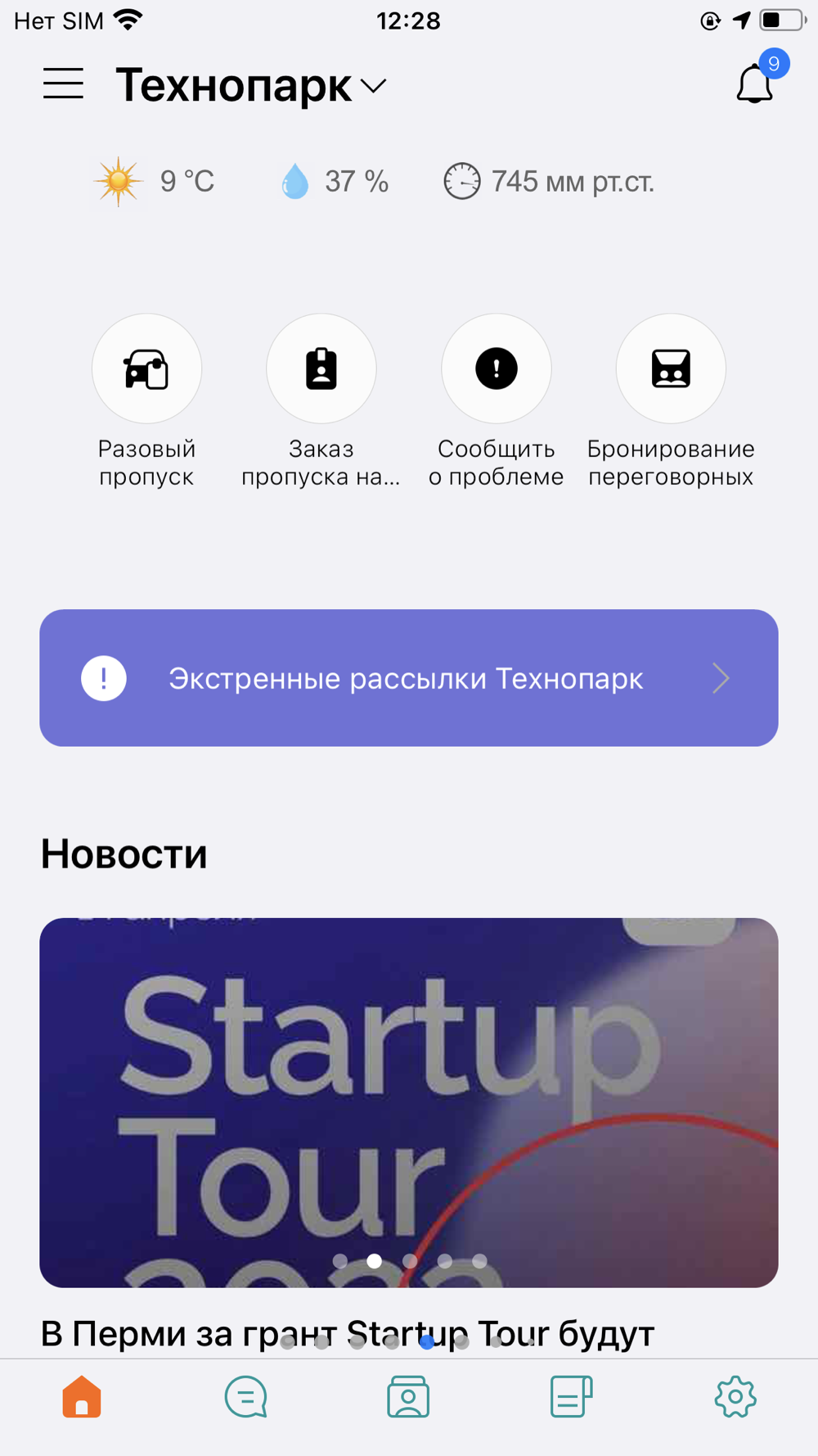 - Technopark services: ordering passes for a car, the ability to report a problem, ordering passes for guests, booking meeting rooms, calendar of events, communication with managers;