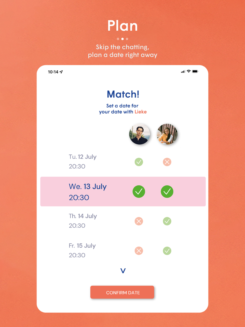 2) If there’s a match, you cannot chat. Instead, you both share your availability with a date picker.