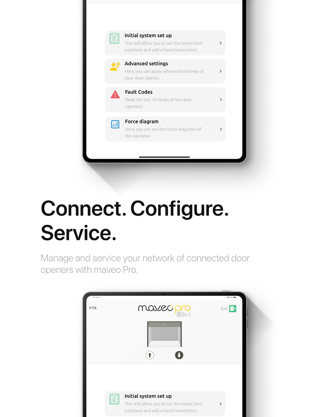 The VTA is a high-quality commercial door drive with direct current technology. After installing the drive, you can use the “maveo pro VTA” app on your smartphone in order to make all settings with just a few clicks. Simply connect your smartphone to the drive via Bluetooth.