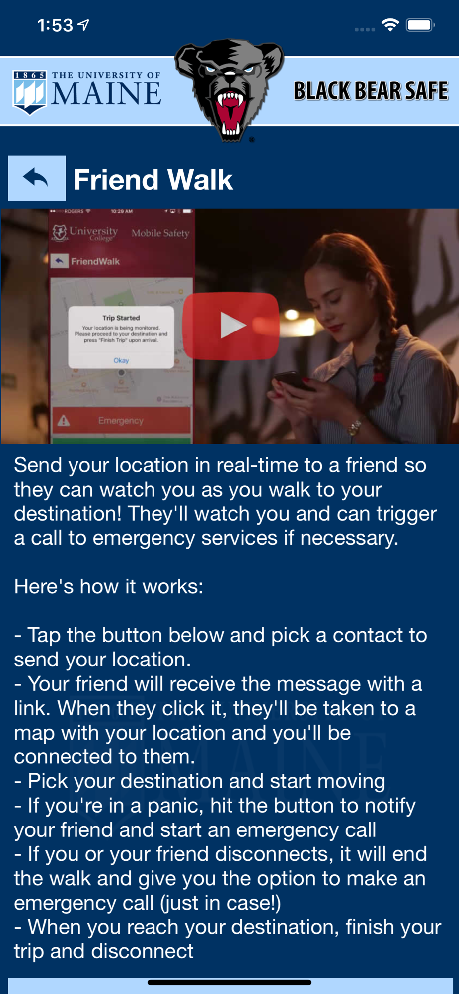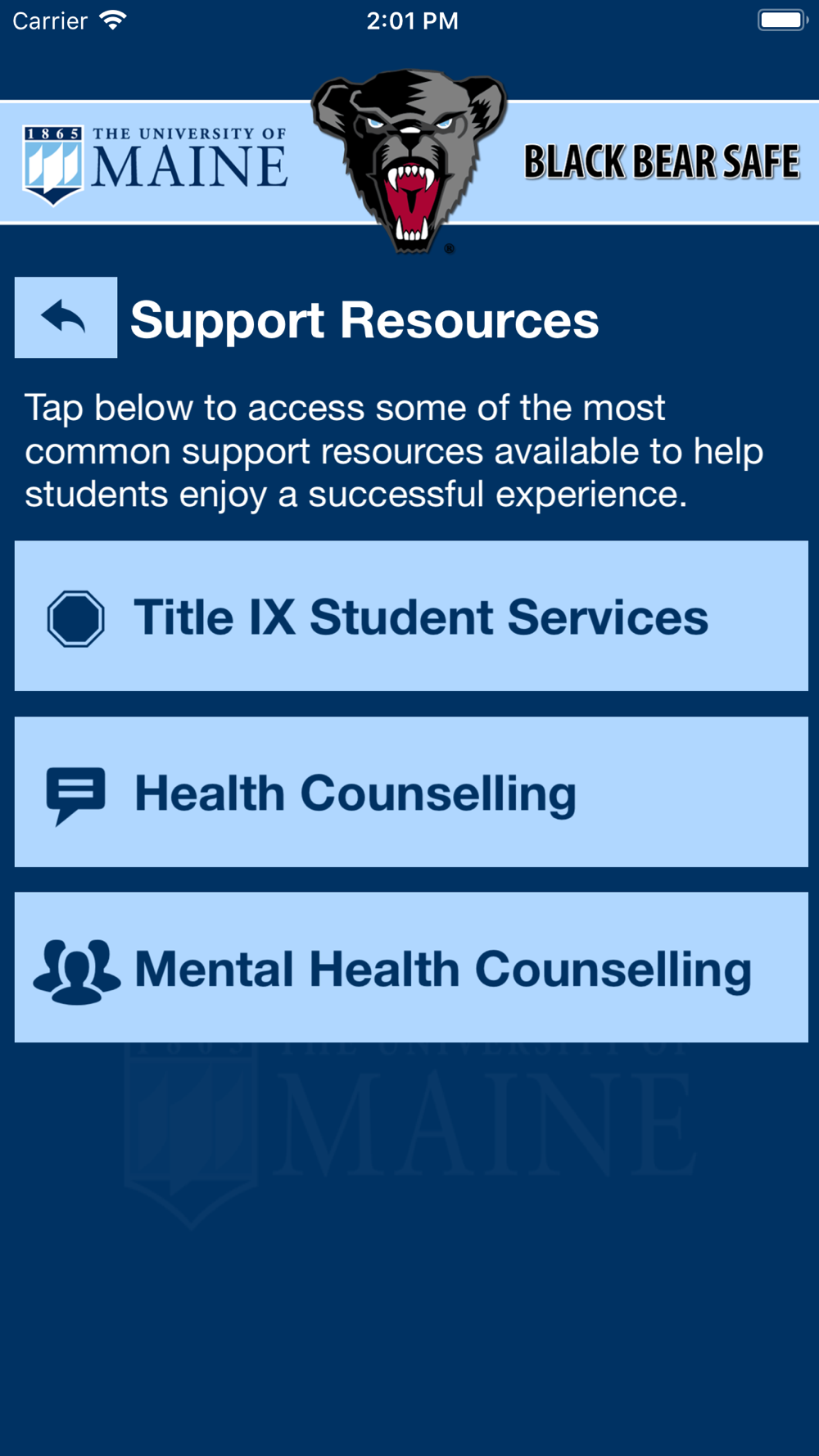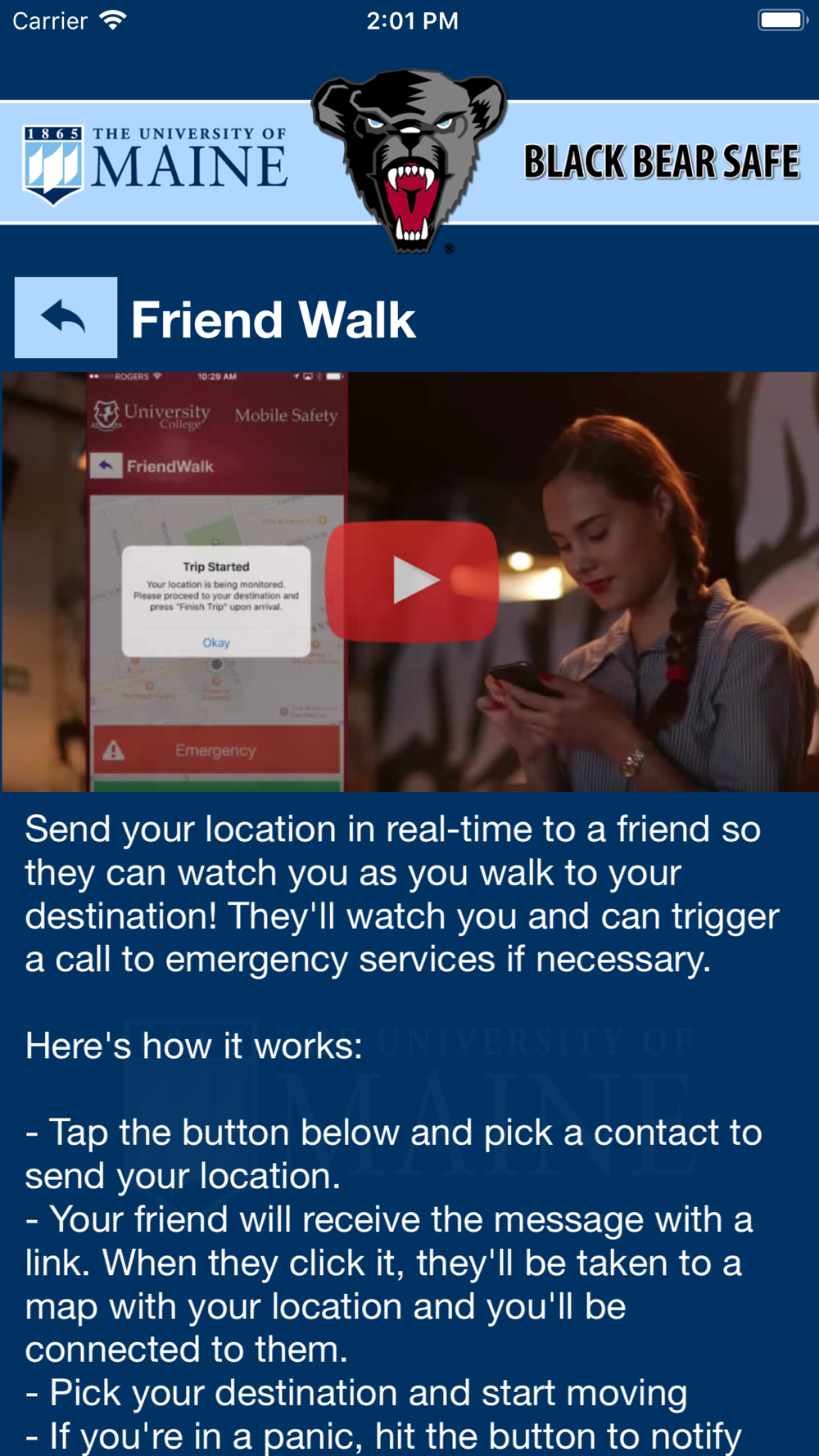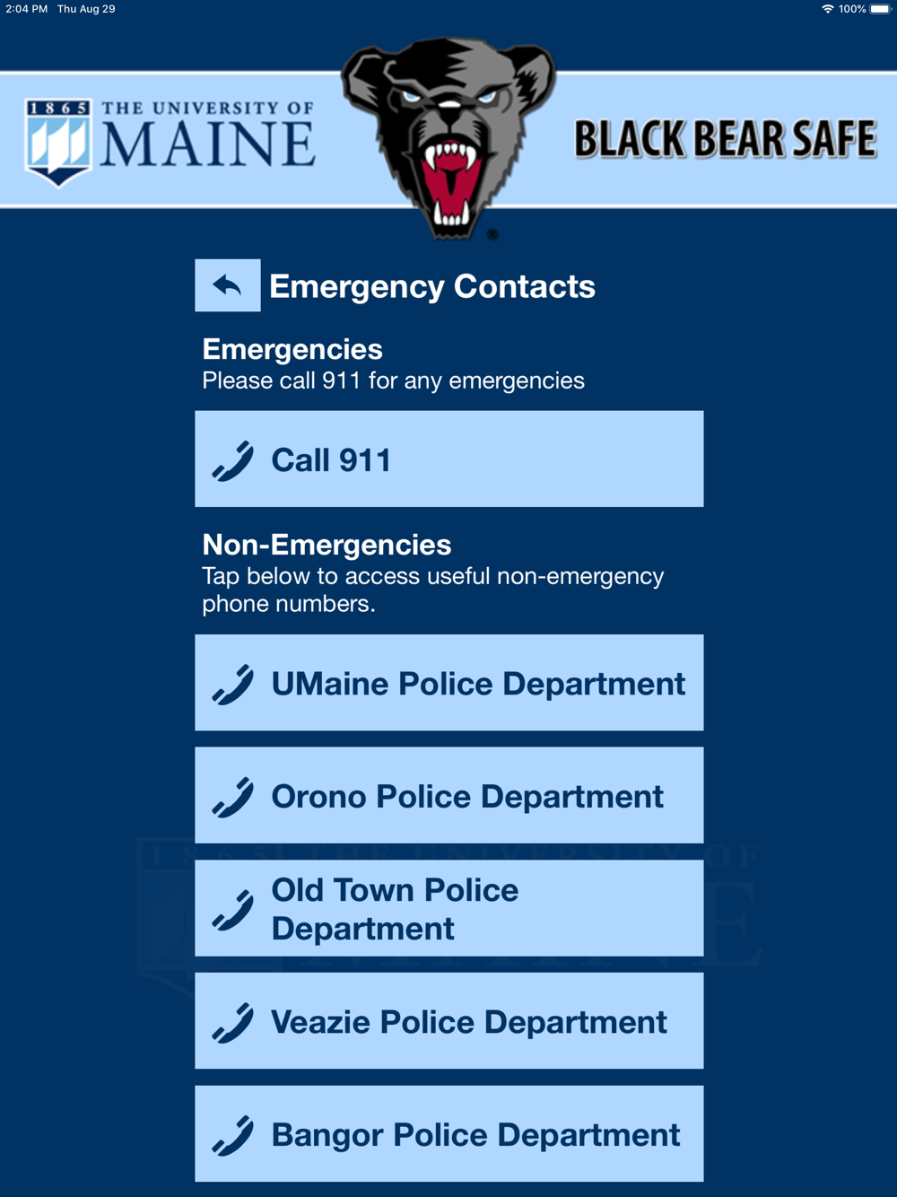 Black Bear Safe is the official safety app of the University of Maine. It is the only app that integrates with the University of Maine's safety and security systems. The University of Maine Police Department has worked to develop a unique app that provides students, faculty and staff with added safety on the University of Maine campus. The app will send you important safety alerts and provide instant access to campus safety resources.