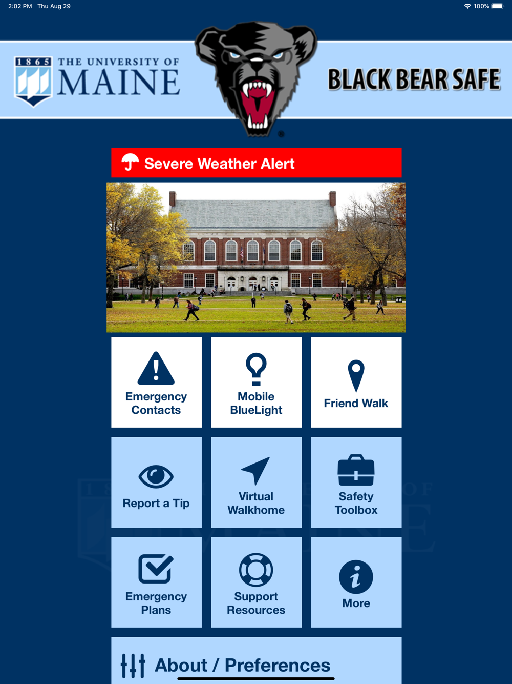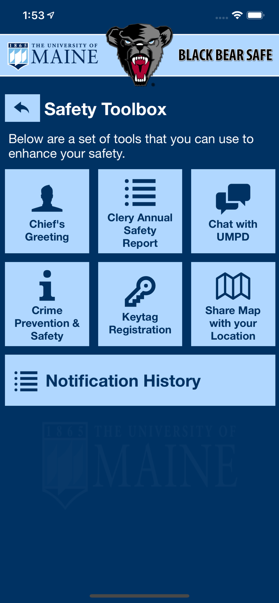 - Safety Notifications: Receive instant notifications and instructions from University of Maine safety when on-campus emergencies occur.
