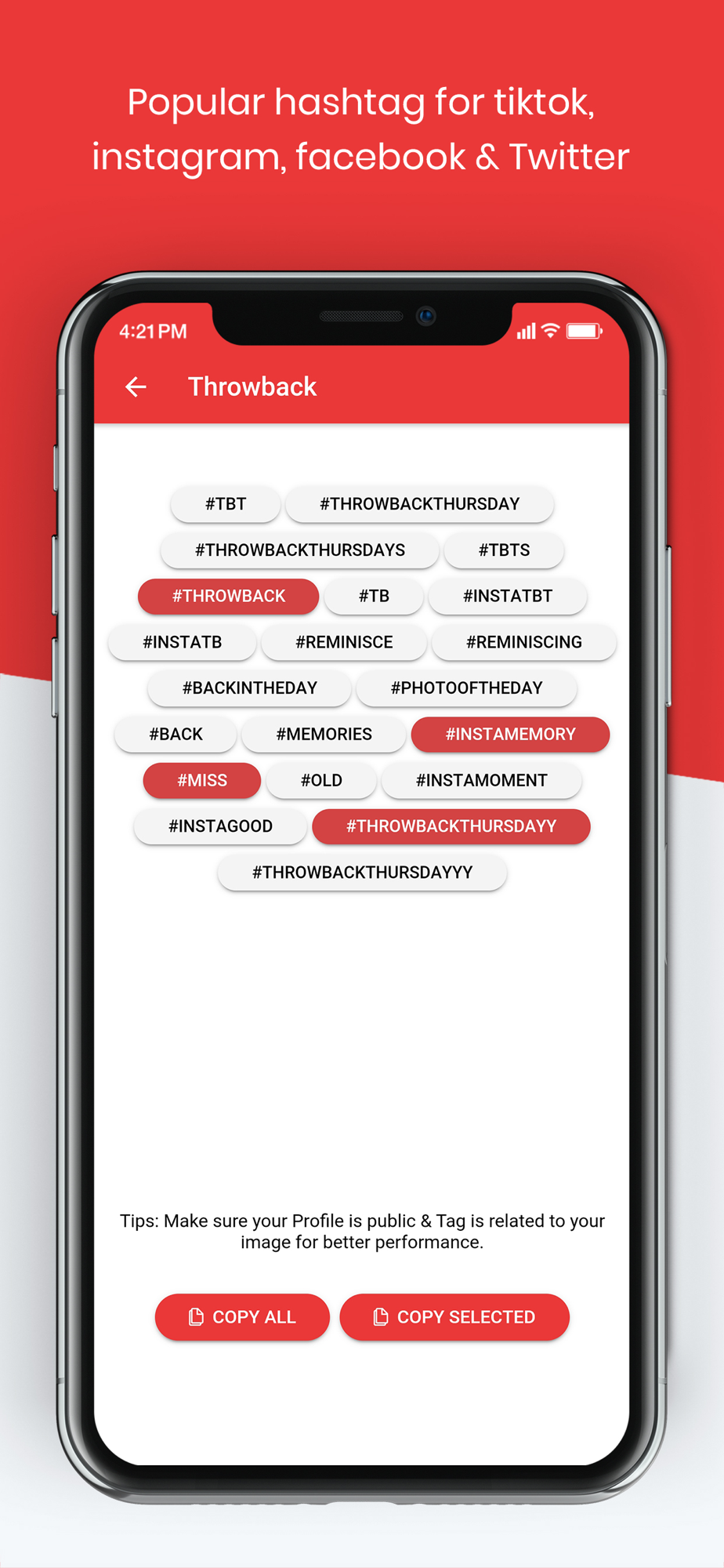 App has More than 5000+ most followed, popular and trending facebook hashtags & 2500+.