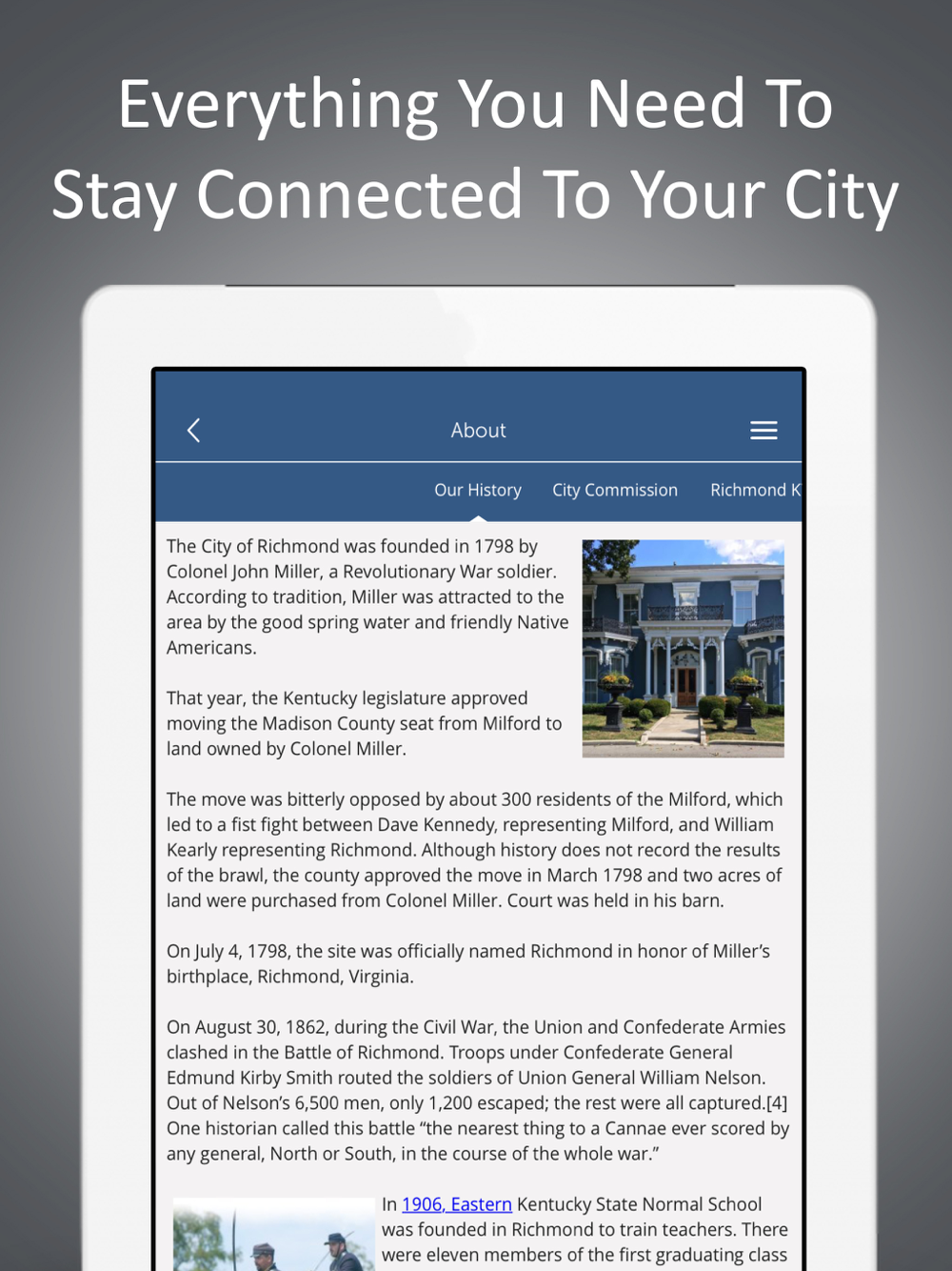 Become a civic citizen and engage with your city like never before by downloading the official app. With features like About, Community Services, Recreation, Public Safety, Report an Issue, and Calendar you'll find it easier than ever to stay connected with the City of Richmond, KY with just a few taps on your mobile device.