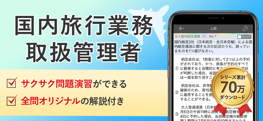 ・過去問の問題集、テキスト等で既に国内旅行業務取扱管理者の試験勉強を始めている方で移動時間にも更にスキルアップをはかりたいと考えている方
