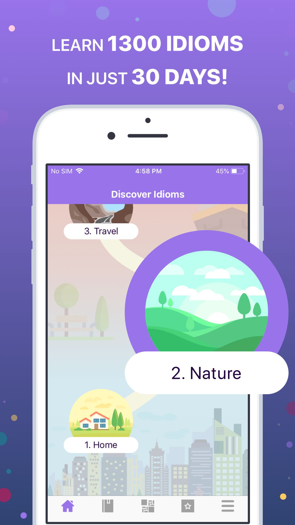1. Learn more than 1300 English Idioms words and expressions, by category and interest. Spend 5 minutes everyday to learn useful expressions which you read in English books or hear in movies. Understand better original English content!