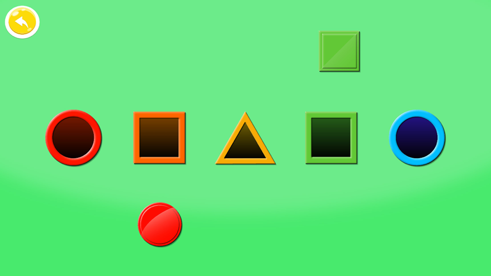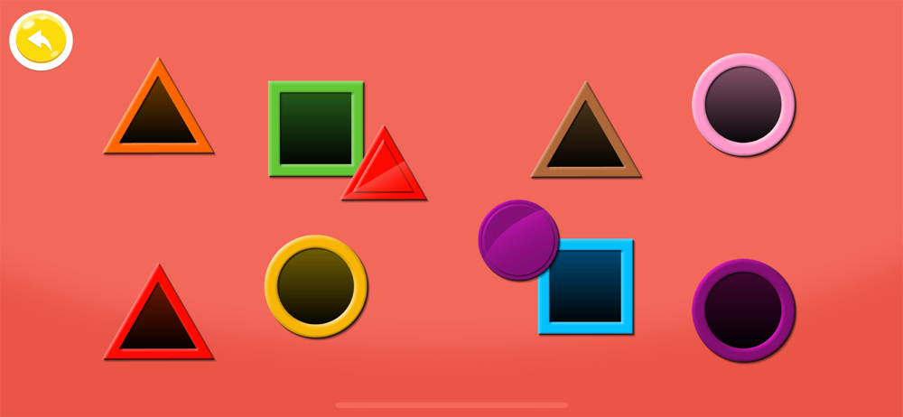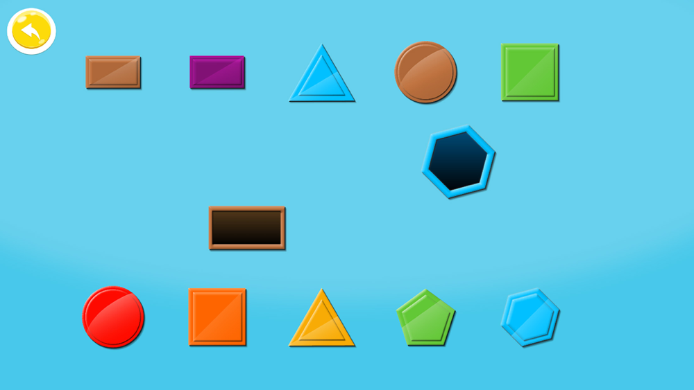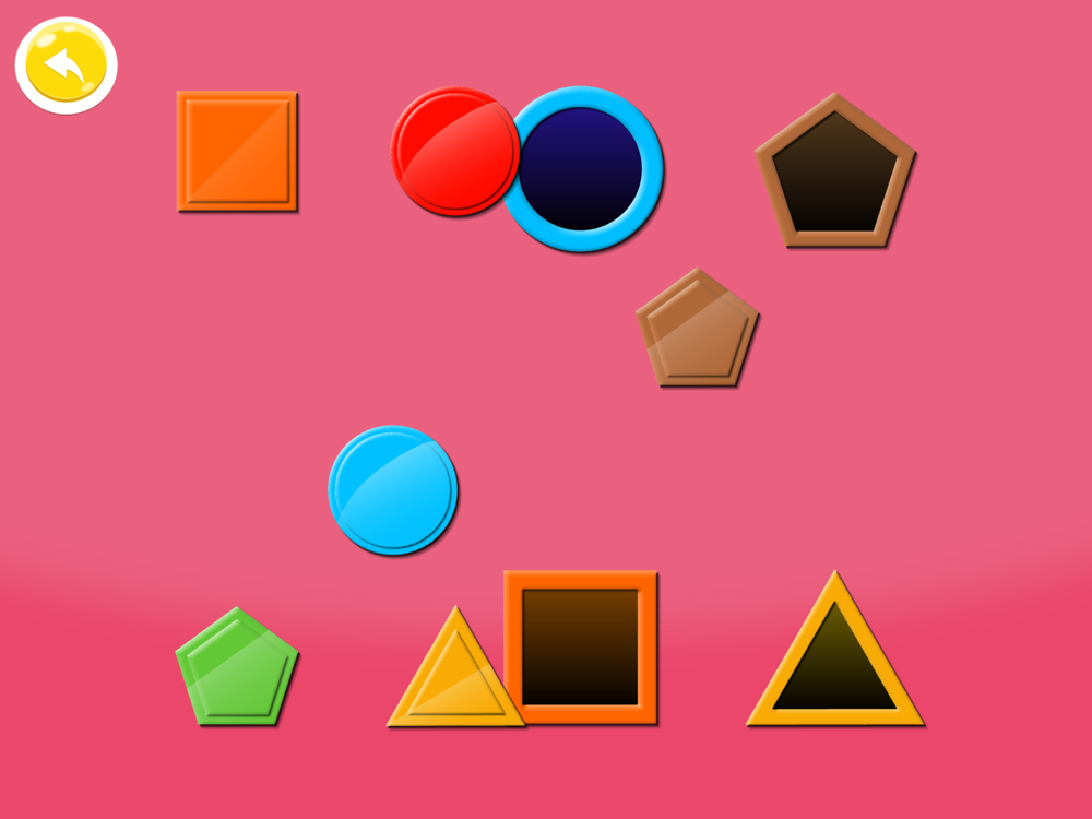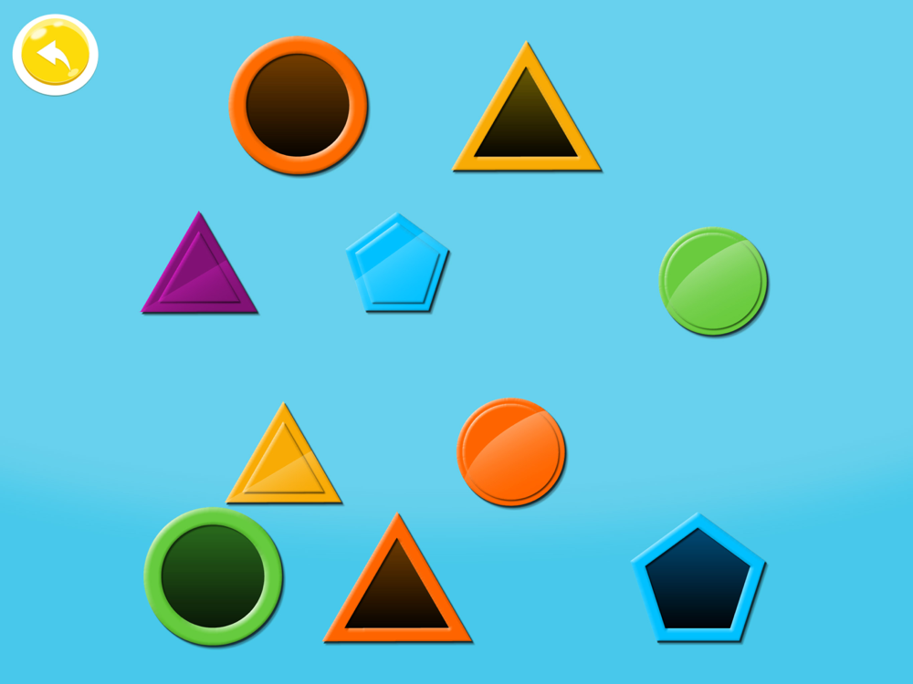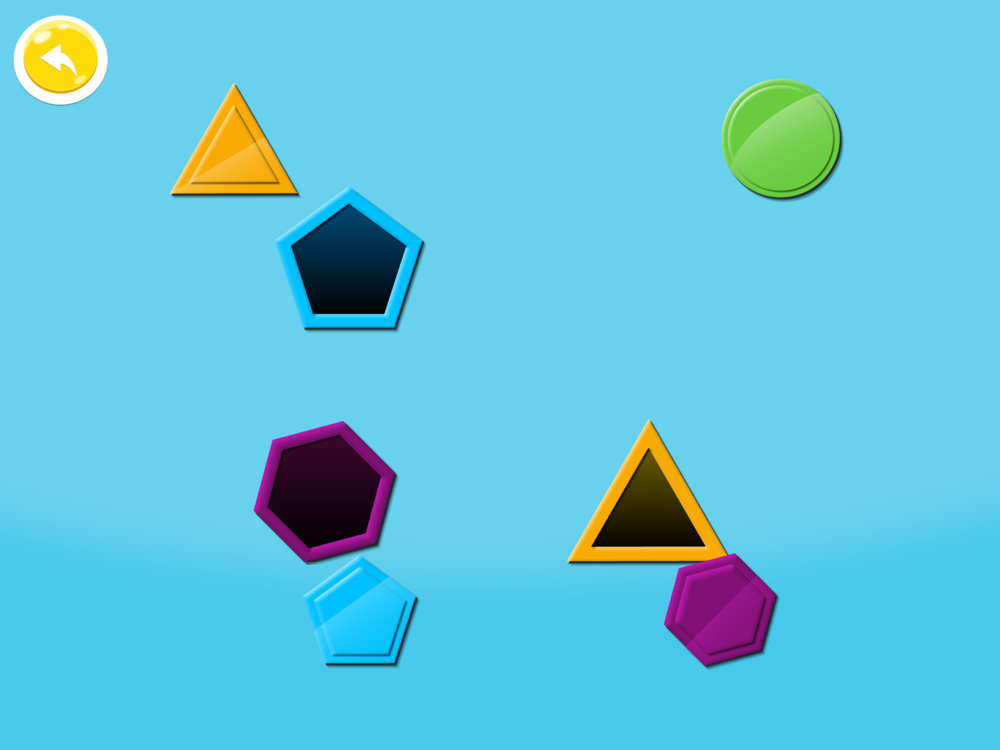 此款app包含三种类型的体验:1,形状大小体验;2,颜色色彩体验;3混合综合体验。包含有多种颜色和大小的三角形、原型、矩形、方形、六边形、五边形。