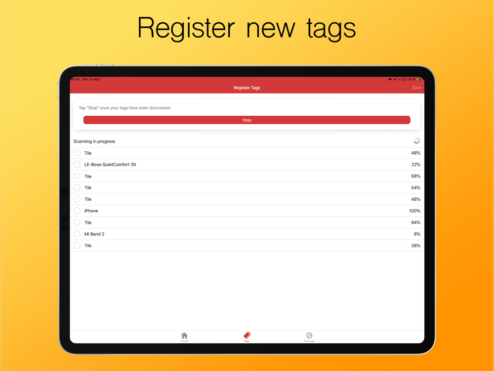 Attach Bluetooth tags to your belongings (keys, wallet, laptop...), register the tags in the app, and then the app will tell you if you are ready to go or if you are forgetting something important.